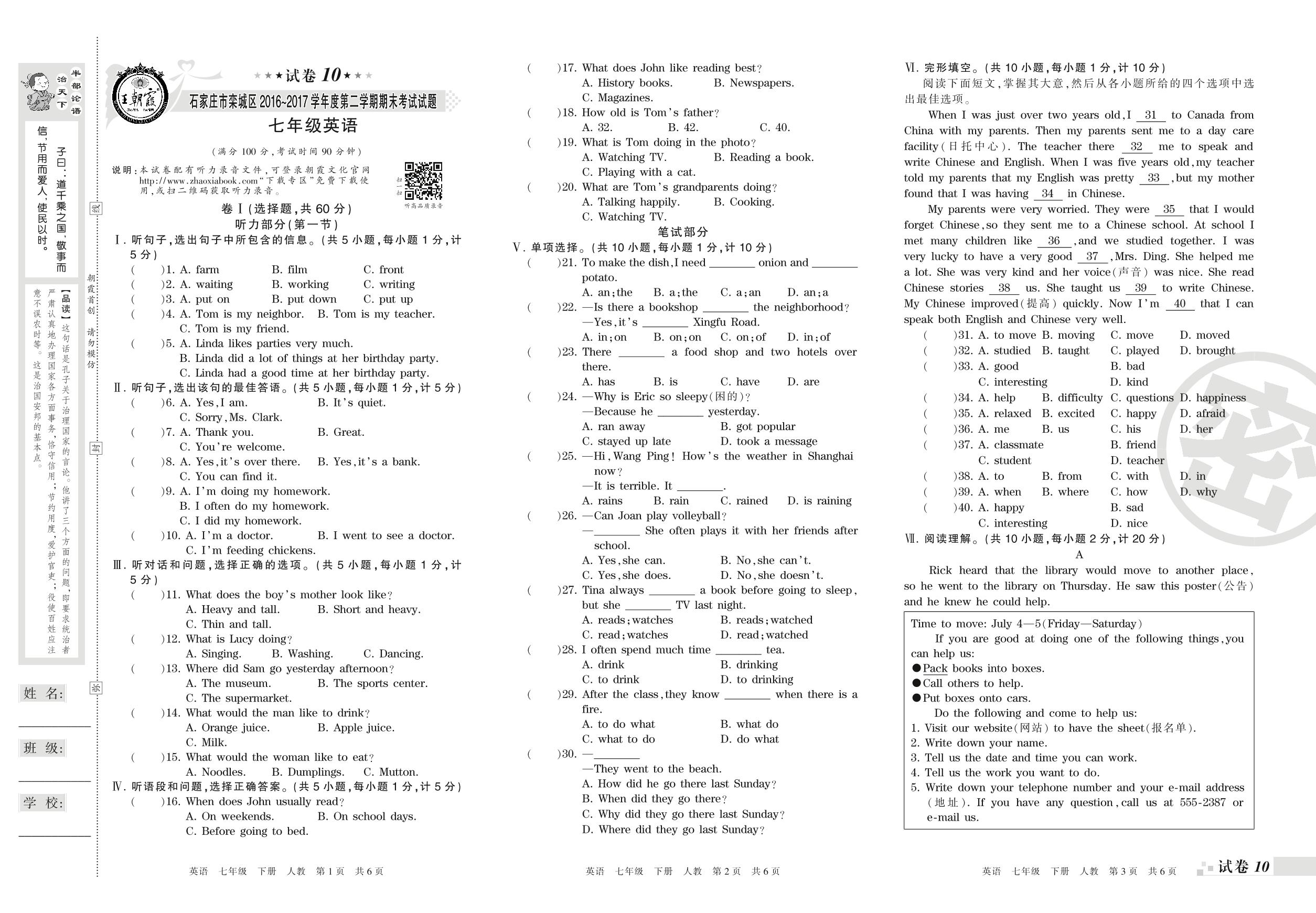 2016-2017学年第二学期石家庄市栾城区七年级英语试卷(人教版)【10】