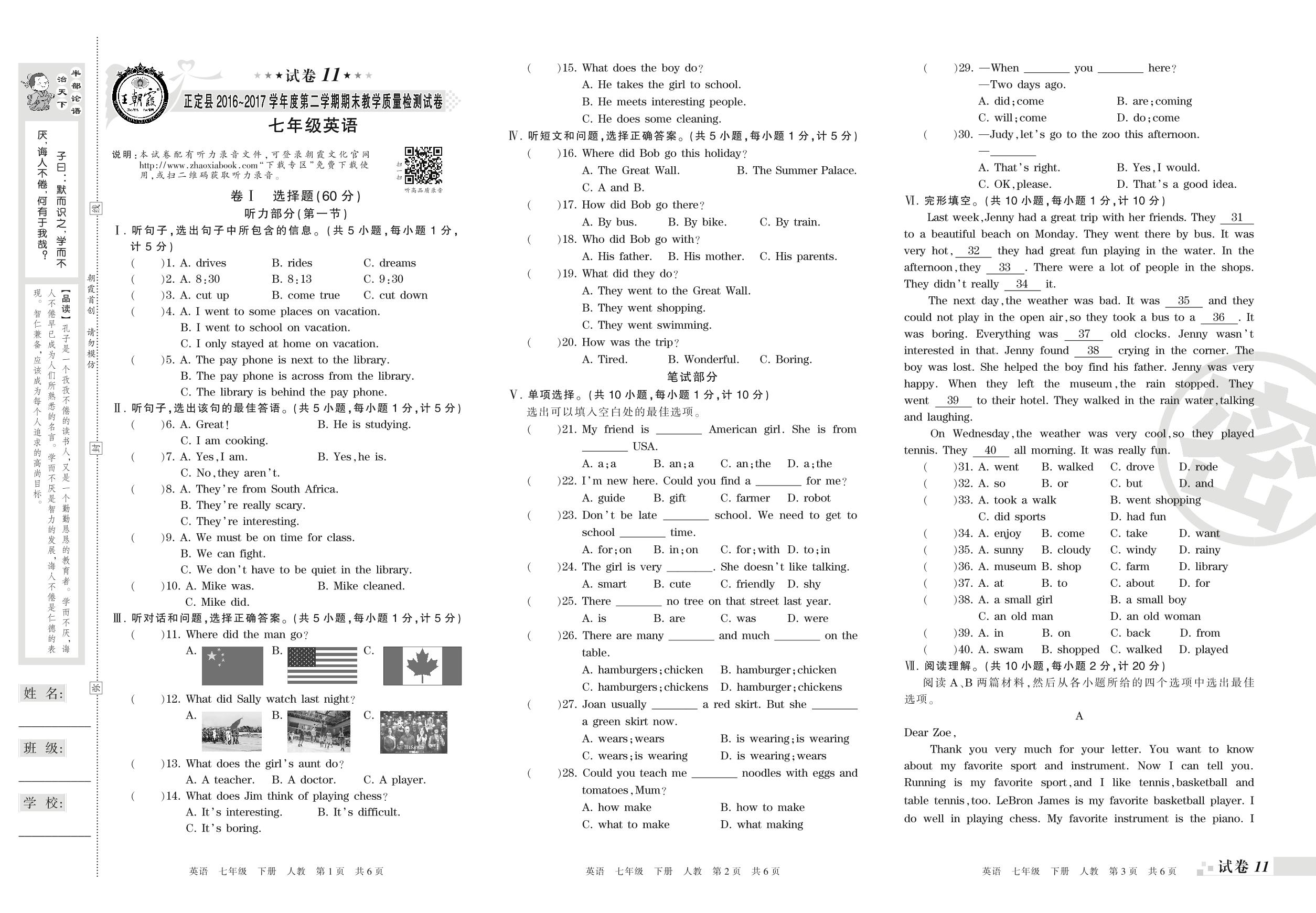 2016-2017学年第二学期石家庄市正定县七年级英语试卷(人教版)【11】