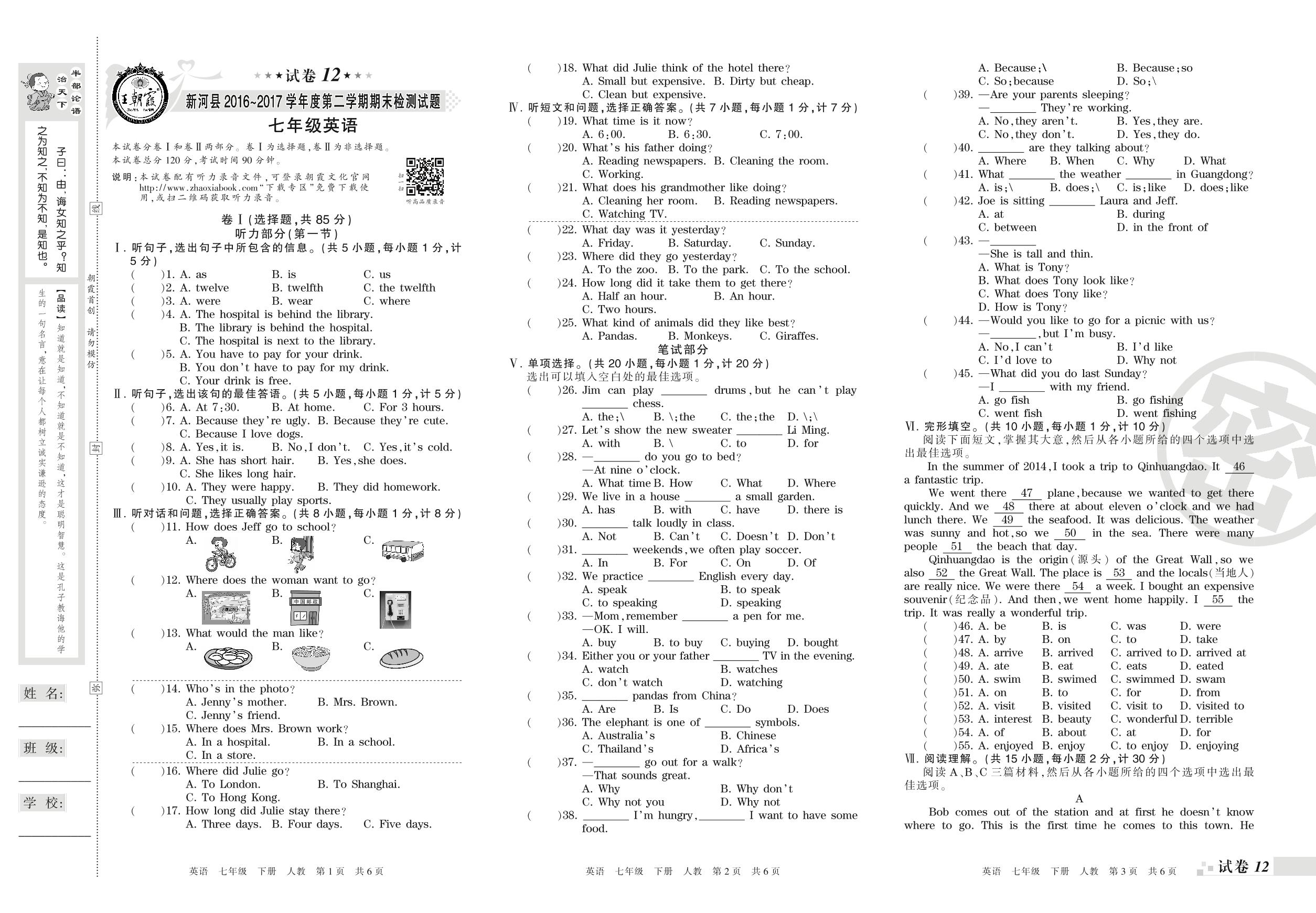2016-2017学年第二学期邢台市新河县七年级英语试卷(人教版)【12】