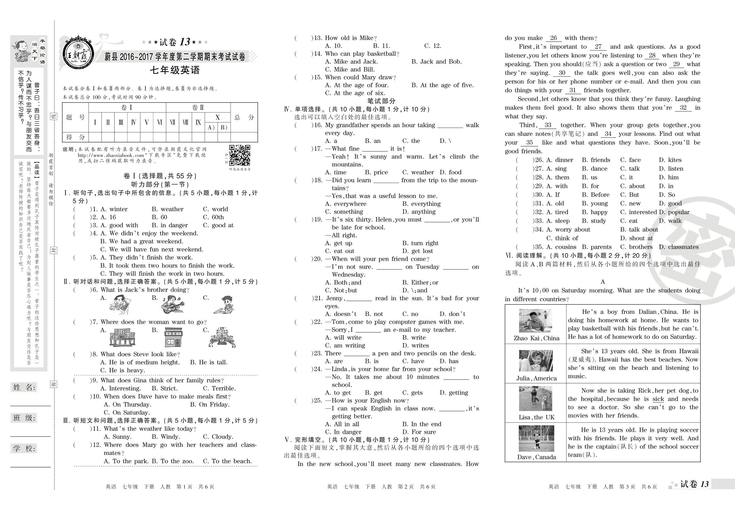 2016-2017学年第二学期张家口市蔚县七年级英语试卷(人教版)【13】