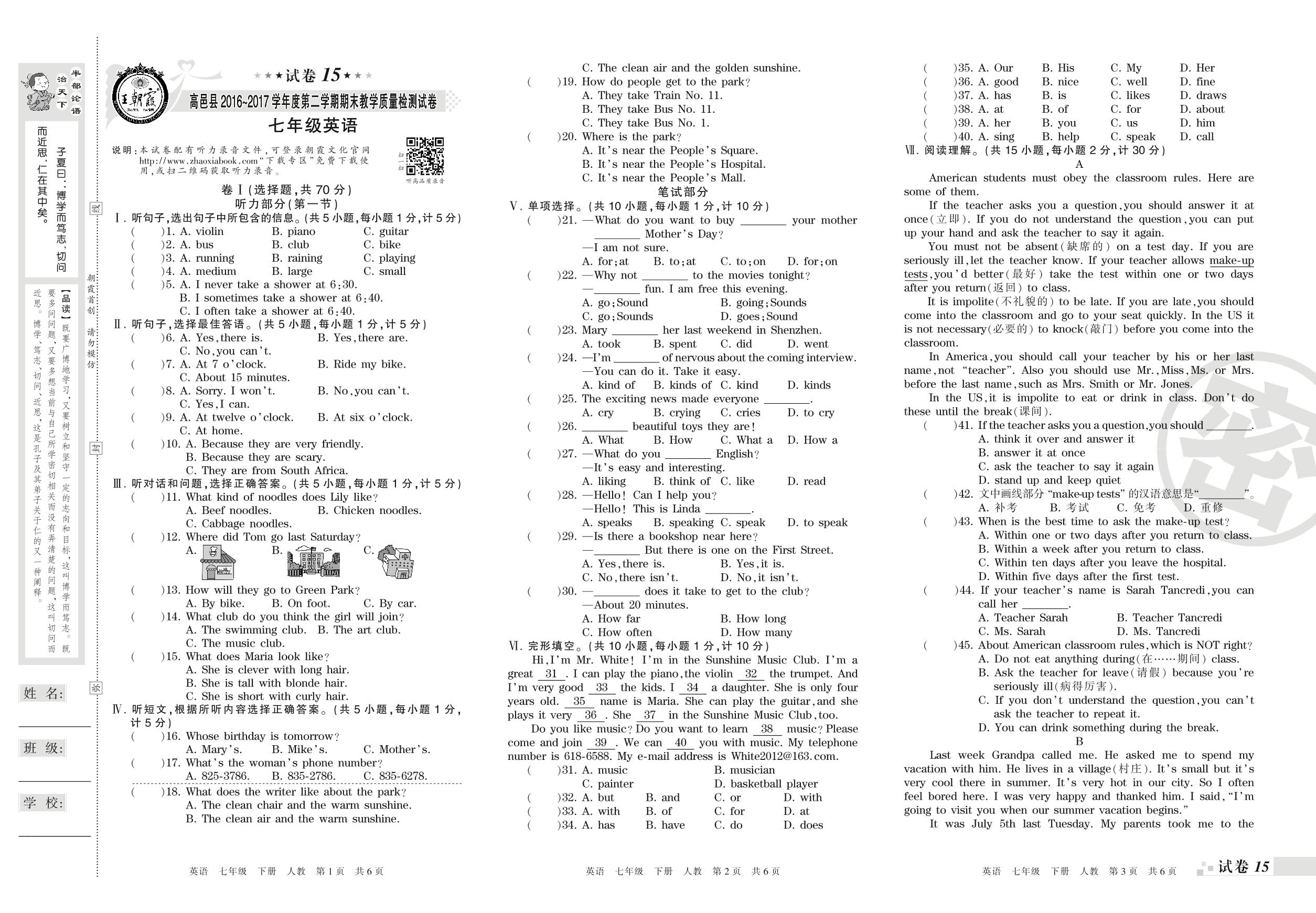2016-2017学年第二学期石家庄市高邑县七年级英语试卷(人教版)【15】