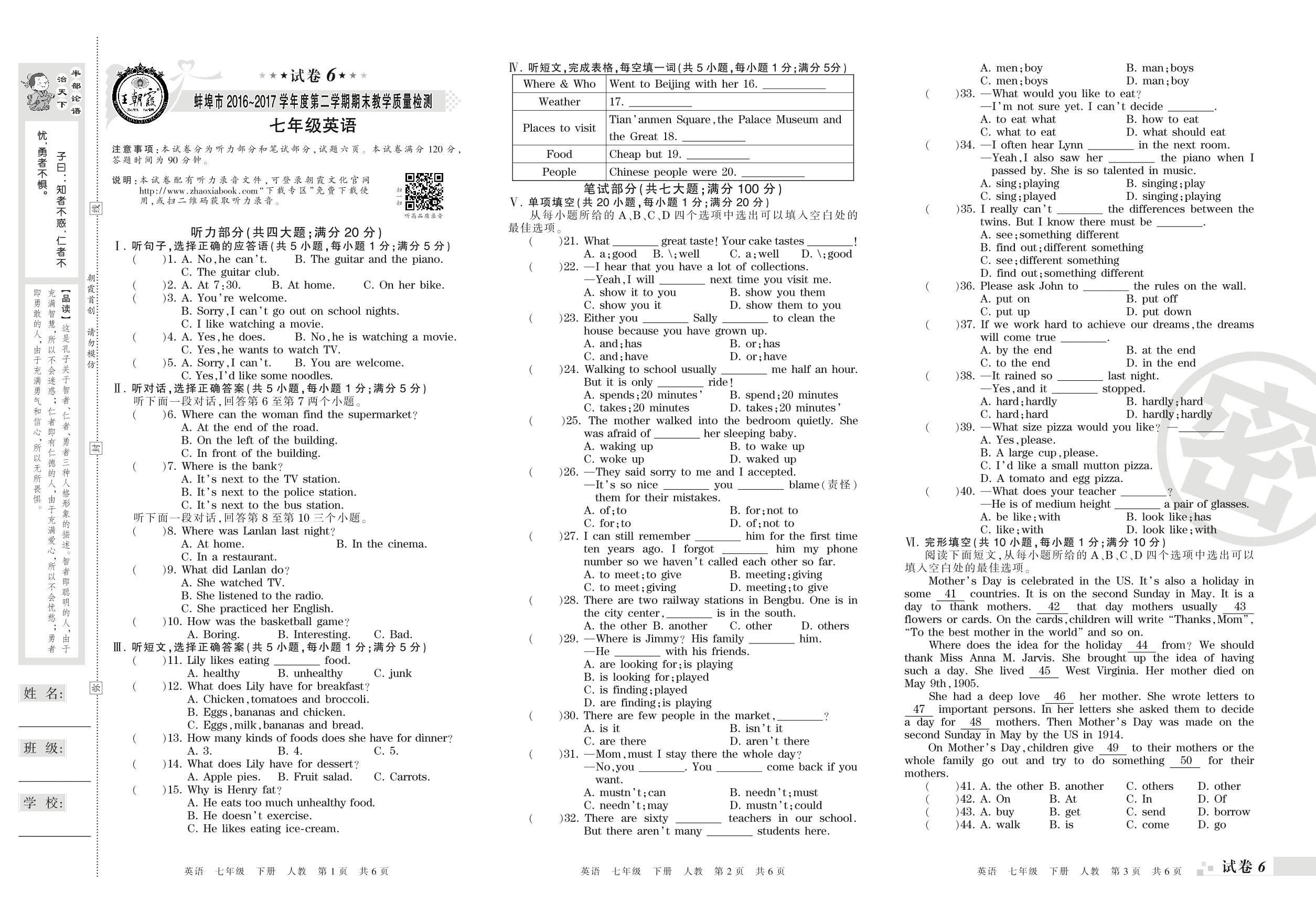 2016-2017学年第二学期蚌埠市七年级英语试卷(人教版)【6】