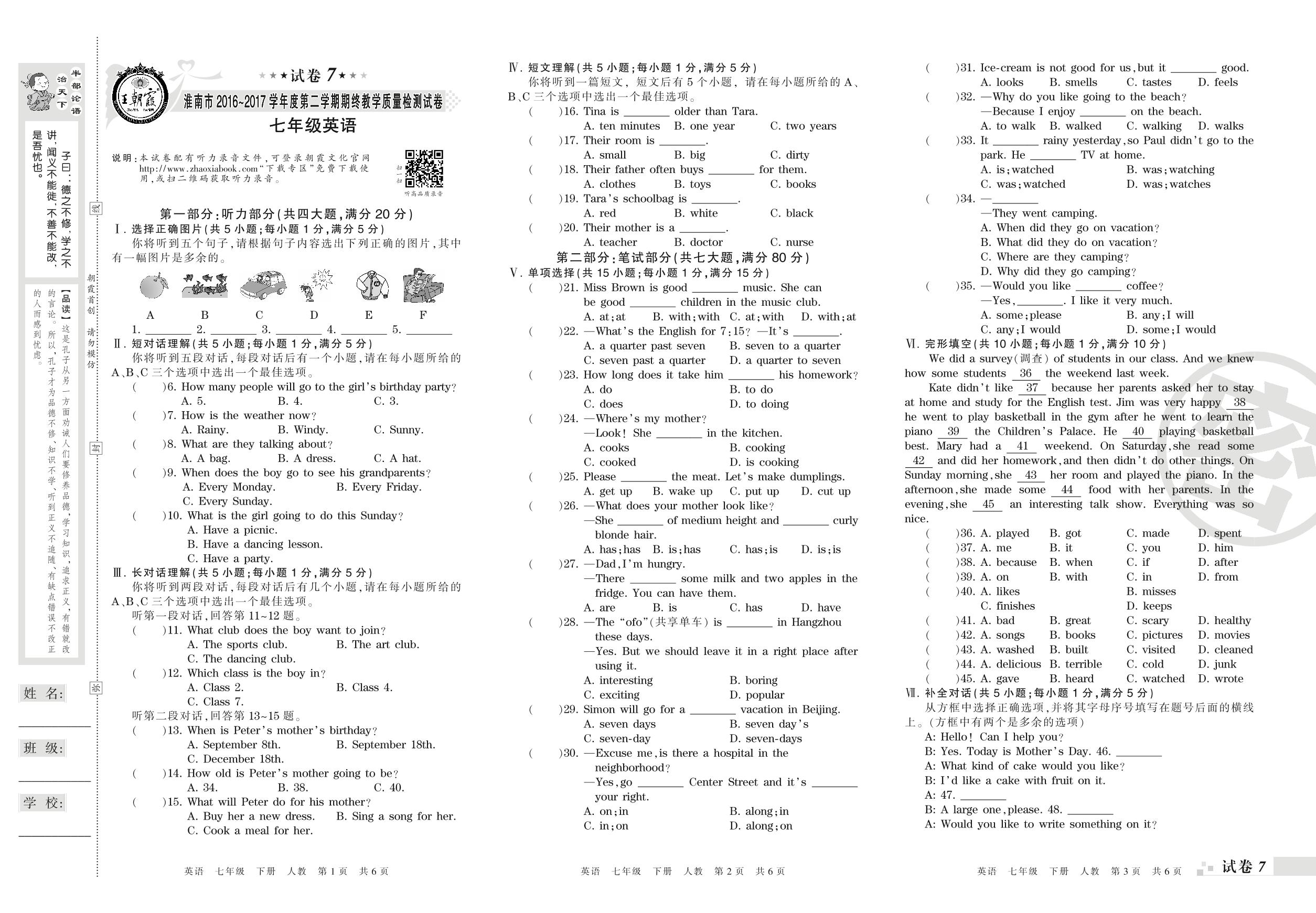 2016-2017学年第二学期淮南市七年级英语试卷(人教版)【7】