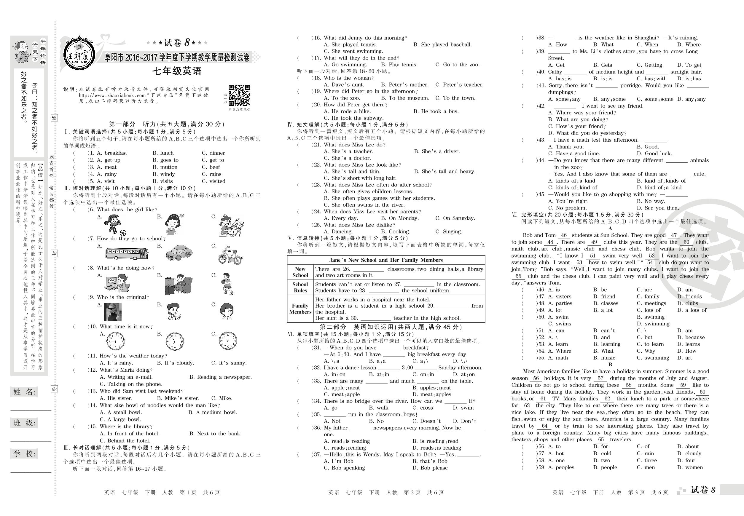 2016-2017学年第二学期阜阳市七年级英语试卷(人教版)【8】