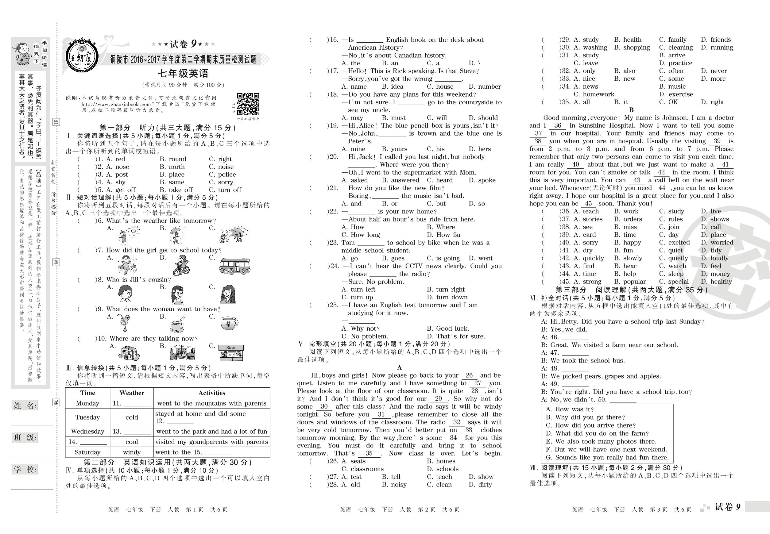 2016-2017学年第二学期铜陵市七年级英语试卷(人教版)【9】