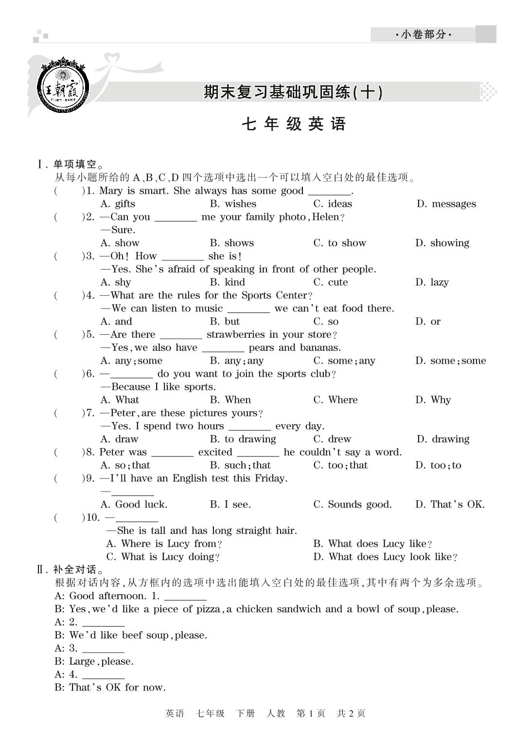 王朝霞期末小卷——期末复习基础巩固练(十)七年级下册英语(人教版)【0】