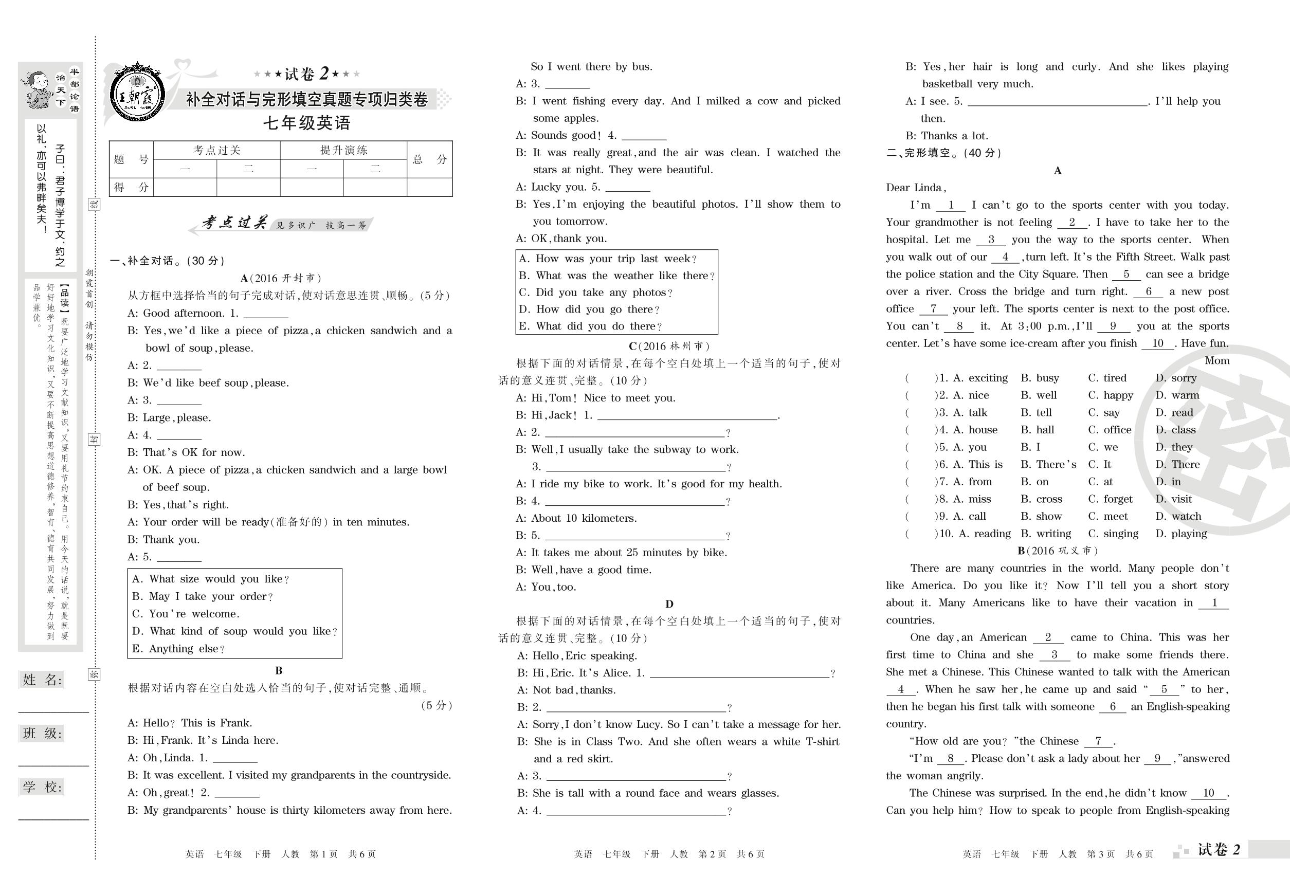 王朝霞期末专项卷——补全对话与完形填空真题专项归类卷七年级下册英语(人教版)_R220123150049146【2】