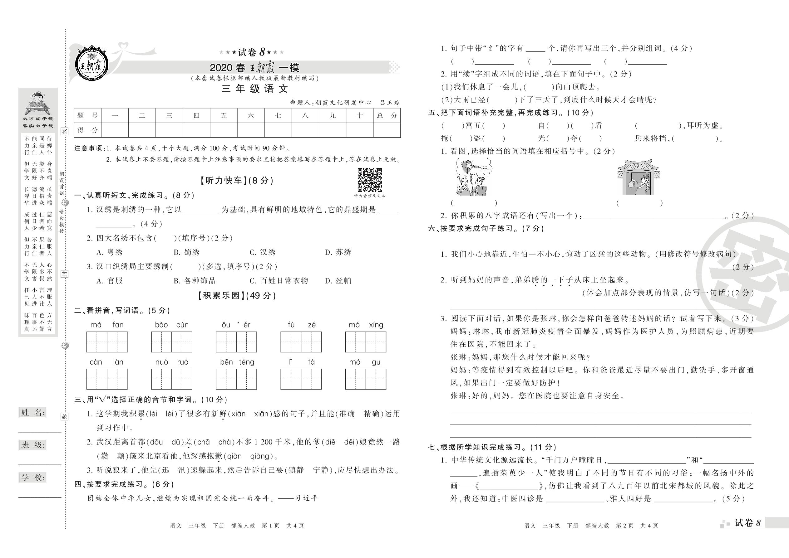 王朝霞期末模拟卷三年级下册语文(人教版)_R21080190730【8】