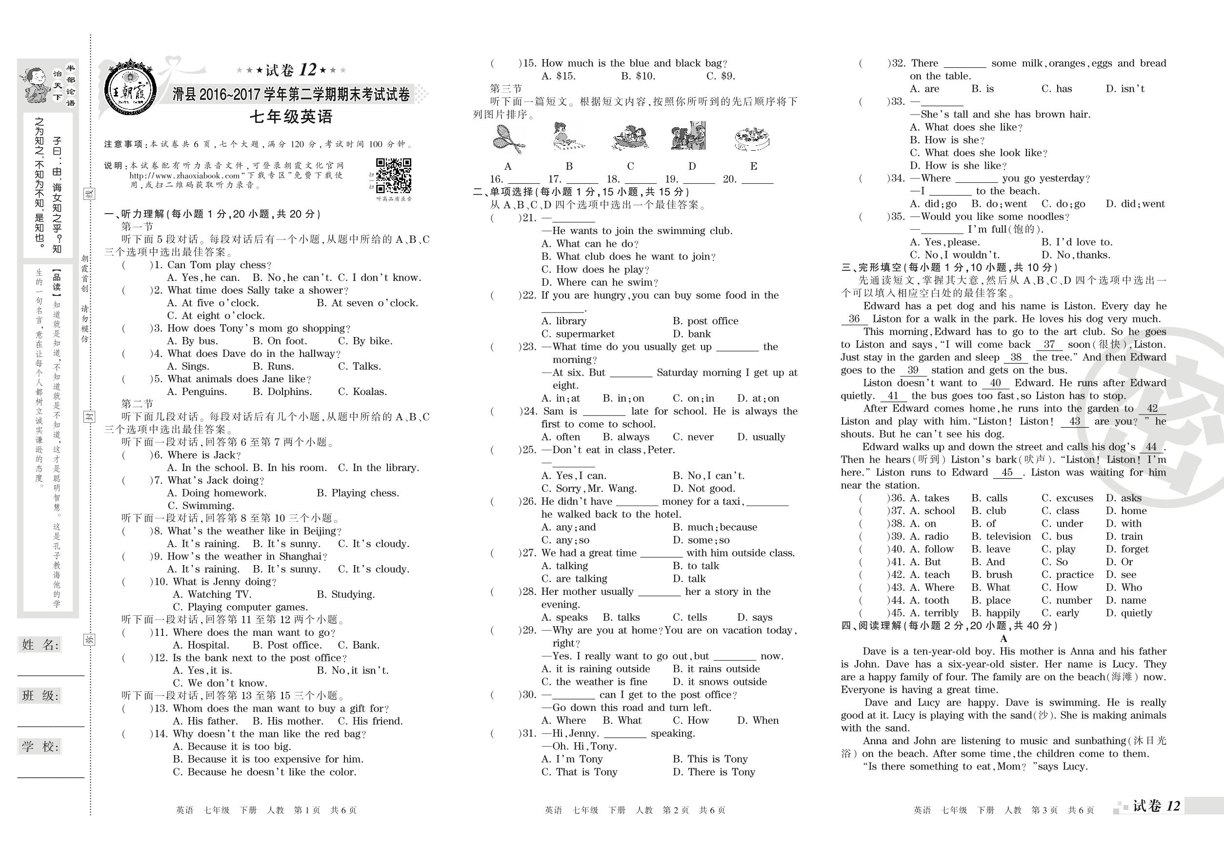 2016-2017学年第二学期安阳市滑县七年级英语试卷(人教版)【12】