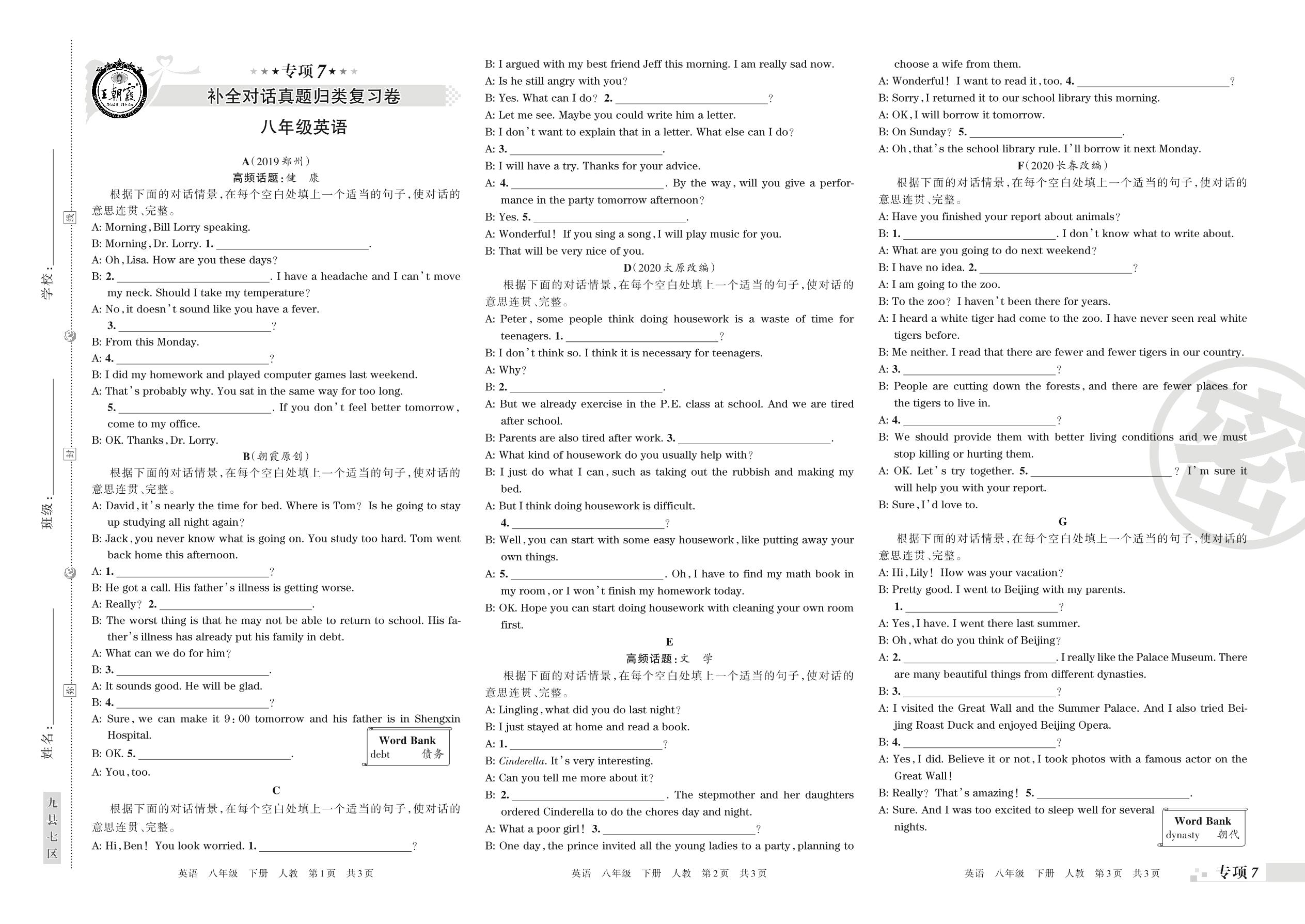 王朝霞期末专项卷——补全对话、书面表达真题归类复习八年级下册英语(人教版)_R21080983239【0】