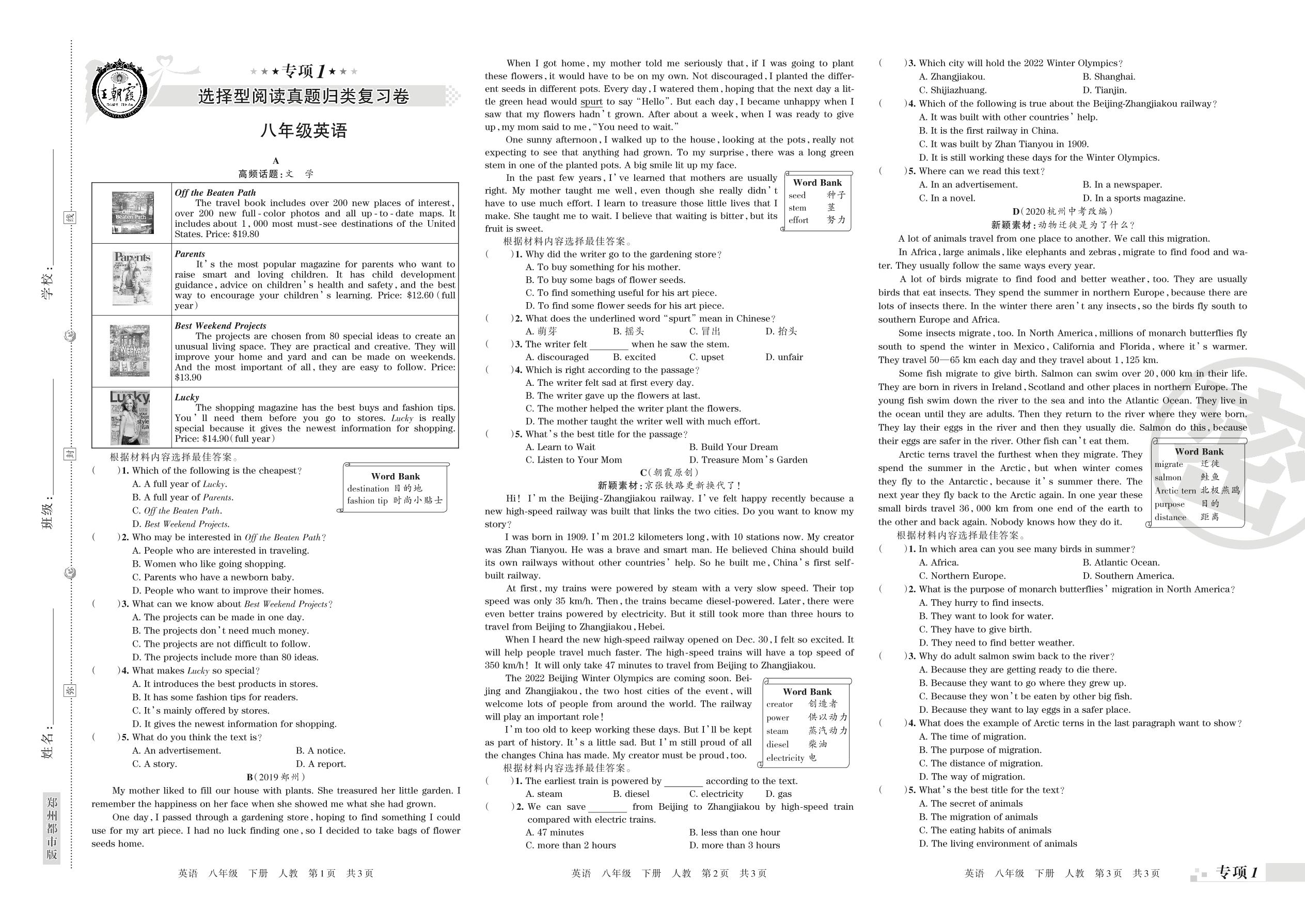 王朝霞期末专项卷——选择型阅读、任务型阅读真题归类复习八年级下册英语(人教版)_R21080983624【0】