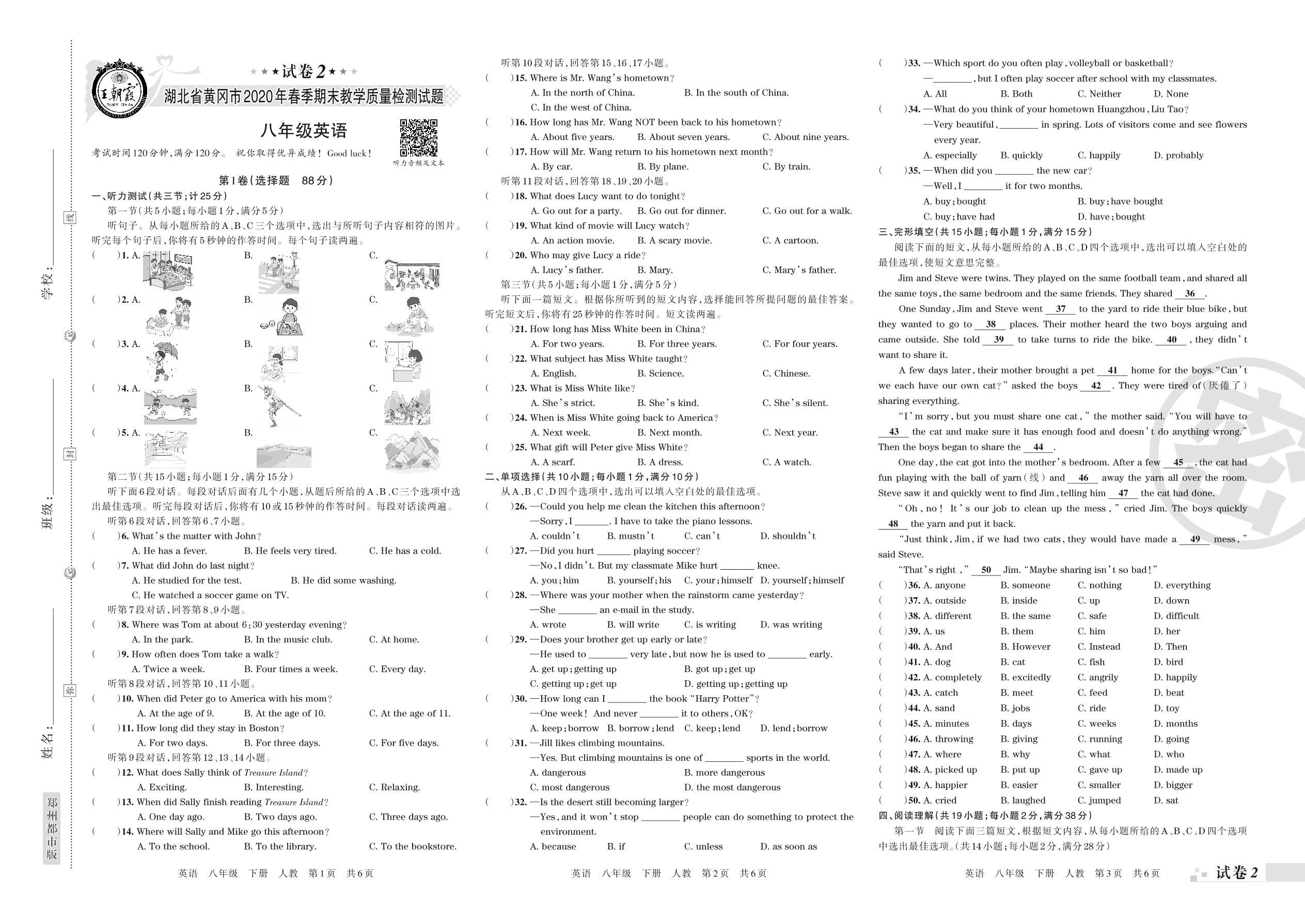 2019-2020学年第二学期湖北省黄冈市八年级英语试卷(人教版)【2】