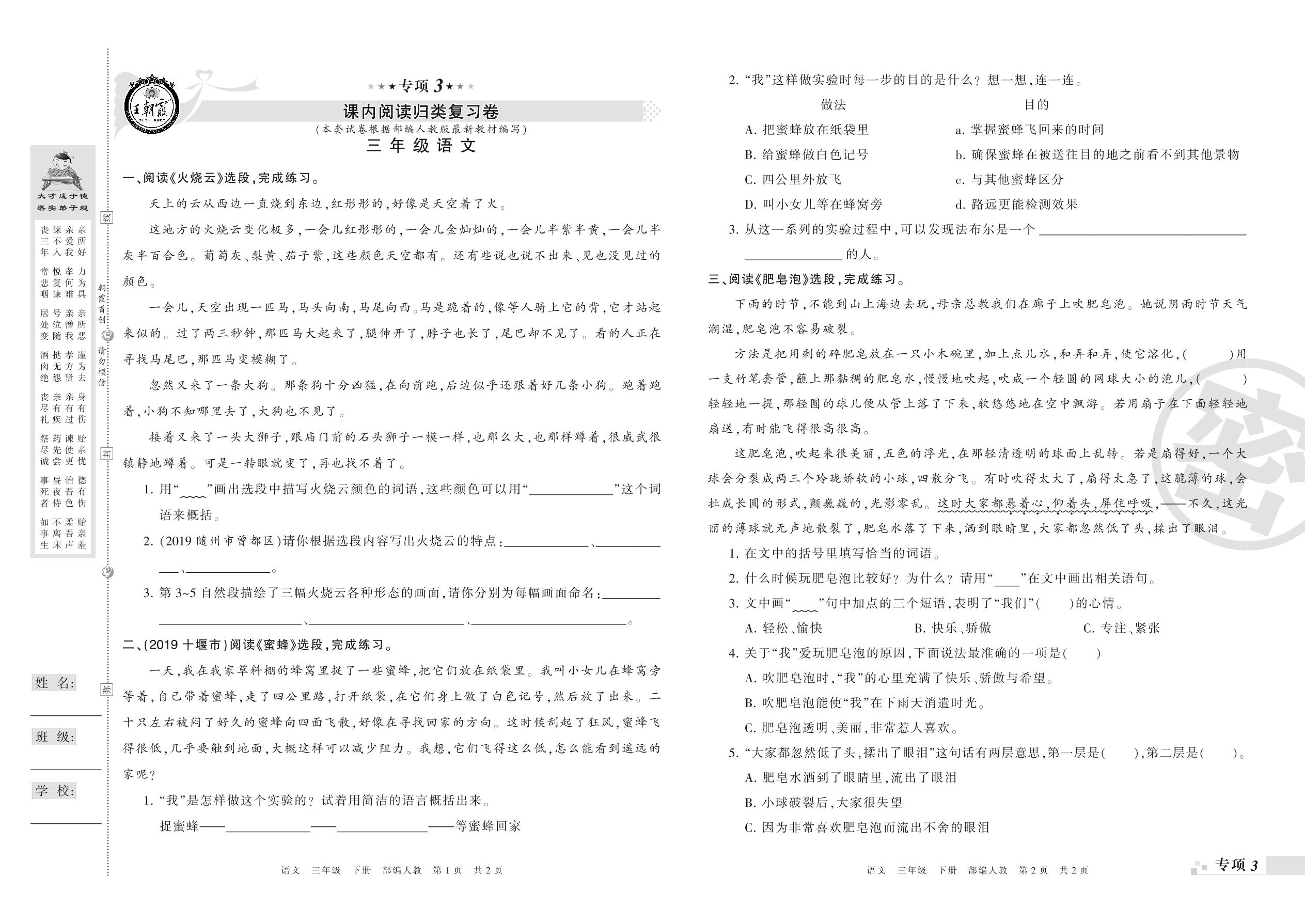 王朝霞期末专项卷——课内阅读、课外阅读真题归类复习卷三年级下册语文(人教版)_R21080190750【0】
