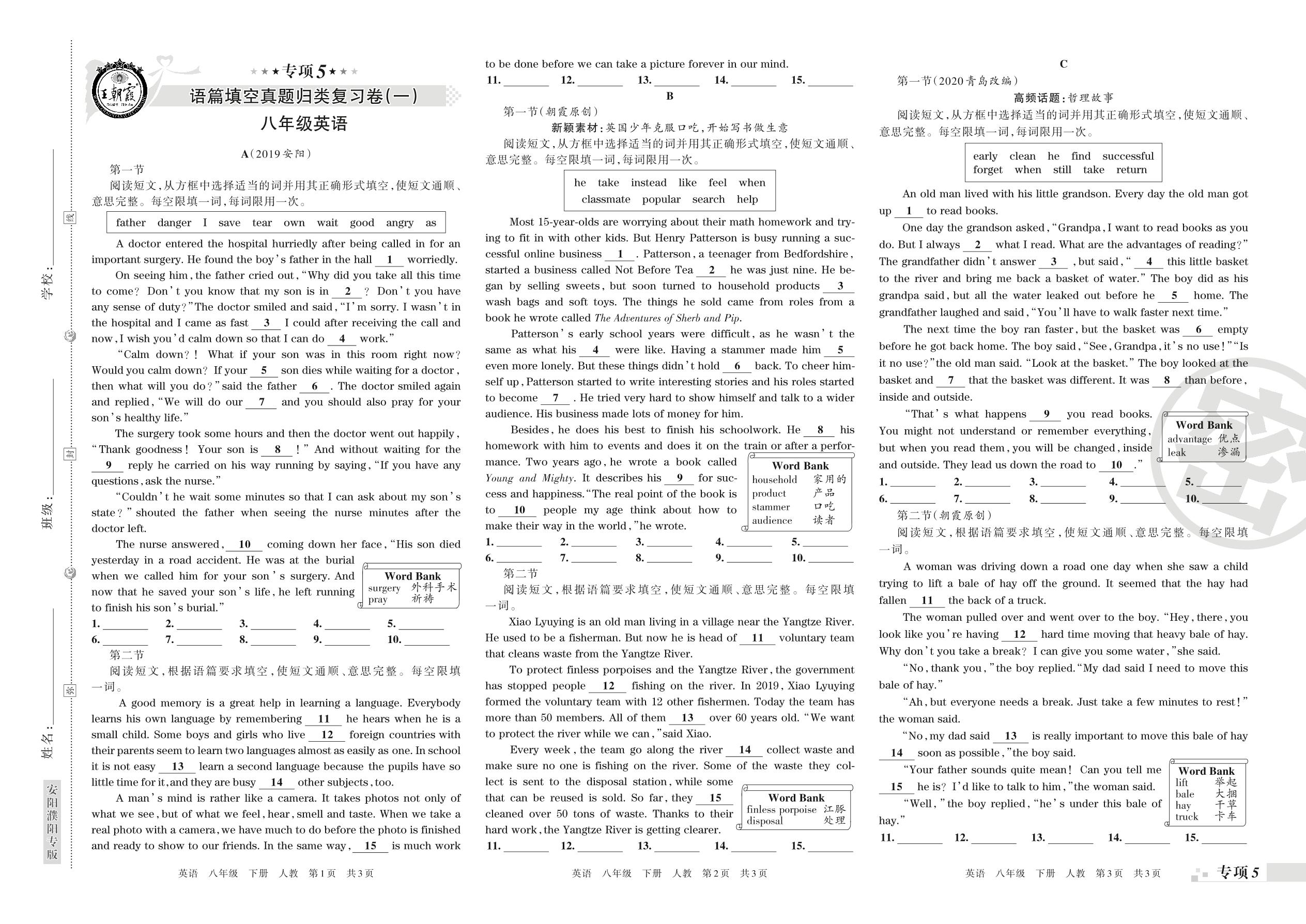 王朝霞期末专项卷——语篇填空(一)、(二)真题归类复习八年级下册英语(人教版)【0】