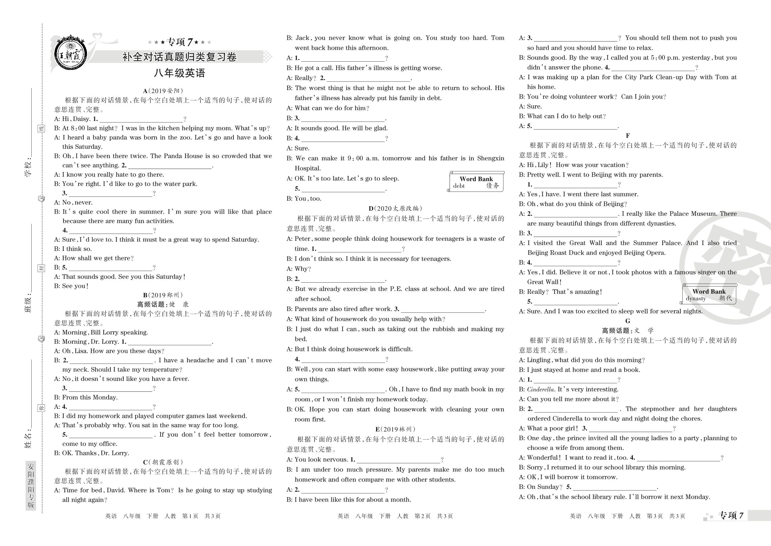 王朝霞期末专项卷——补全对话、书面表达真题归类复习八年级下册英语(人教版)【0】