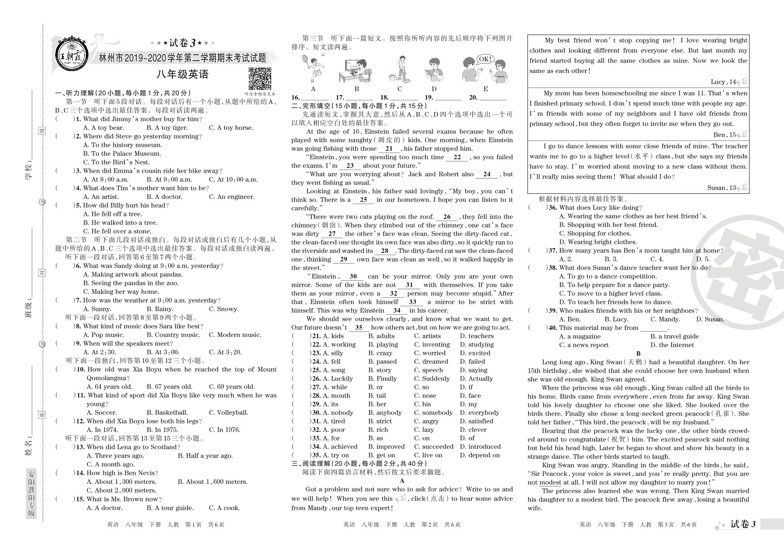 2019-2020学年第二学期林州市八年级英语试卷(人教版)【3】