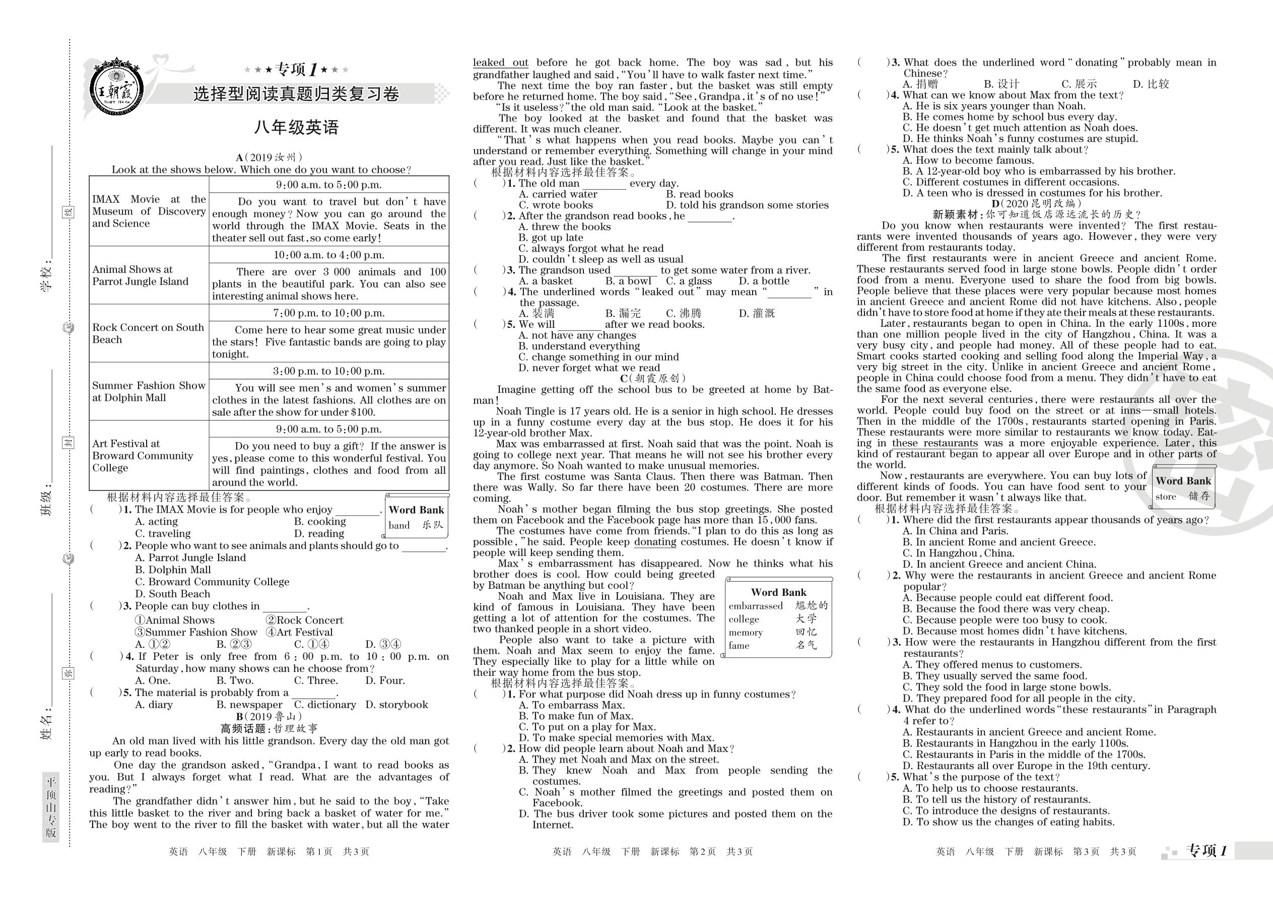 王朝霞期末专项卷——选择型阅读、任务型阅读真题归类复习八年级下册英语(新课版)【0】