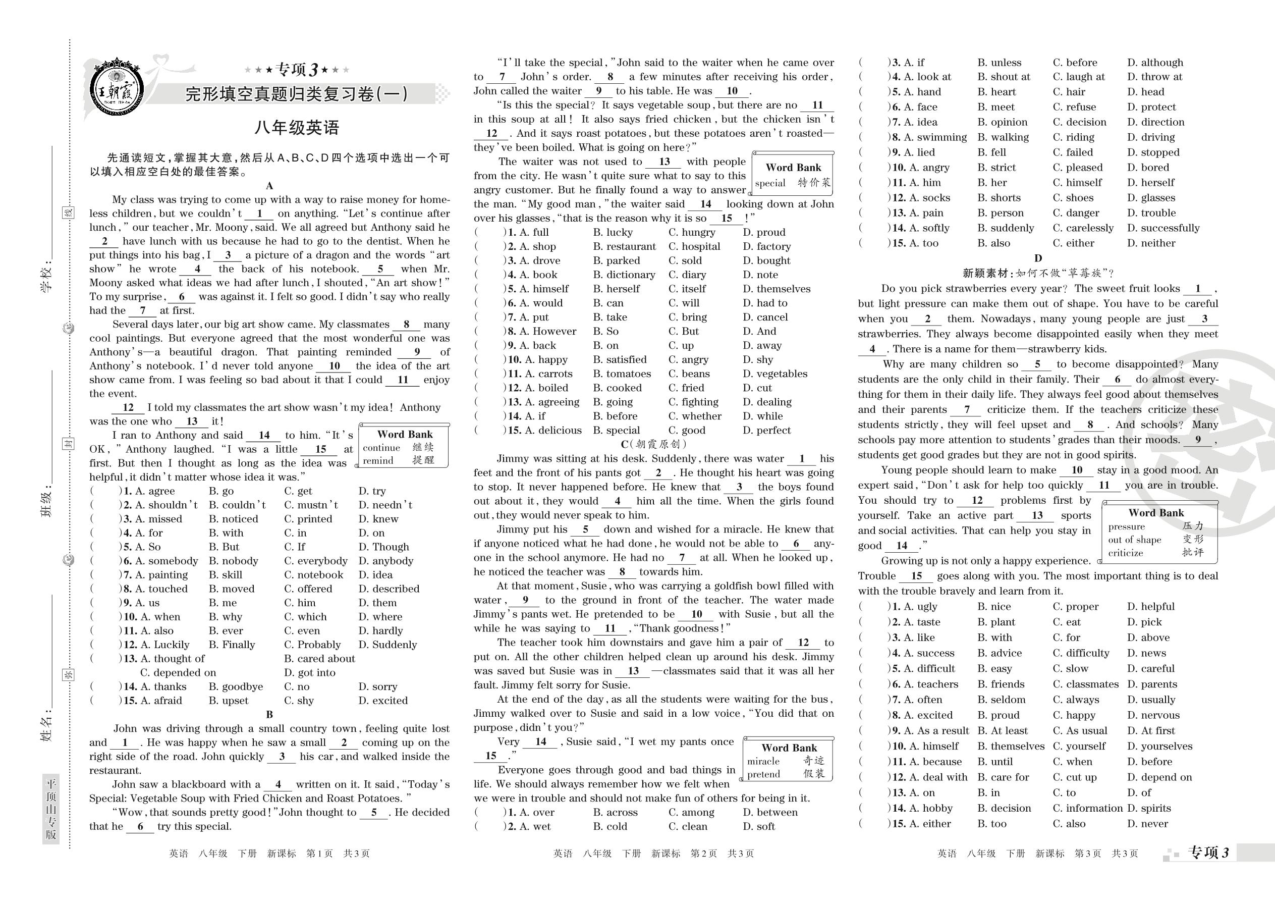 王朝霞期末专项卷——完形填空(一)、(二)真题归类复习八年级下册英语(新课版)【0】