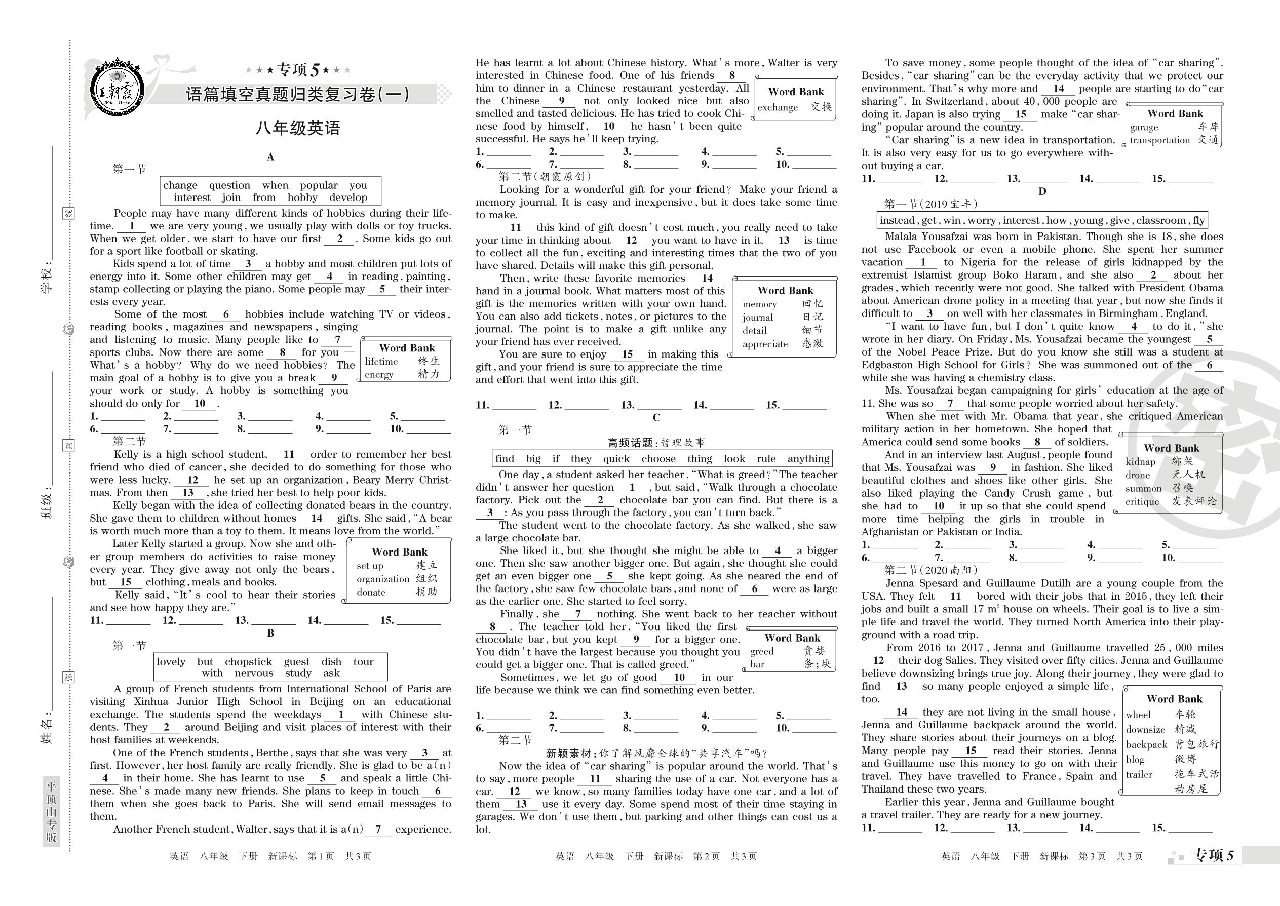 王朝霞期末专项卷——语篇填空(一)、(二)真题归类复习八年级下册英语(新课版)【0】