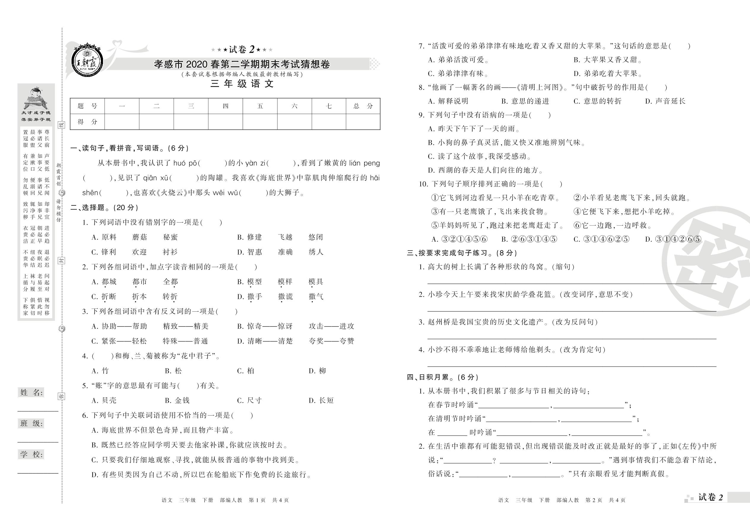 2018-2019学年第二学期孝感市猜想卷三年级语文试卷(人教版)【2】