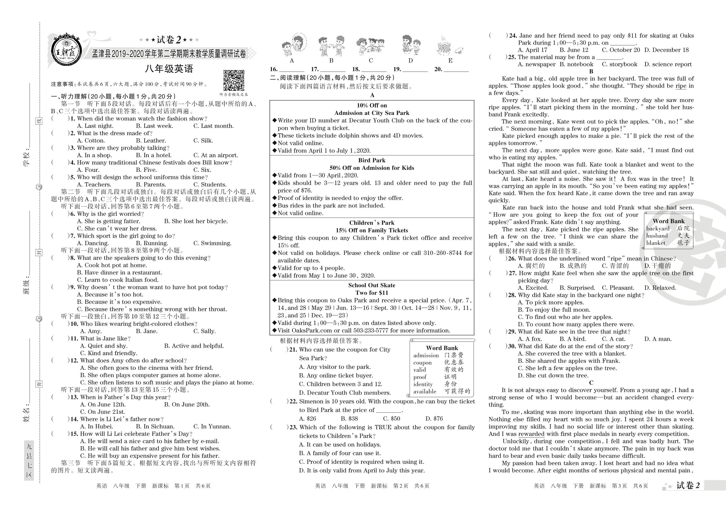 2019-2020学年第二学期洛阳市孟津县八年级英语试卷(新课版)【2】