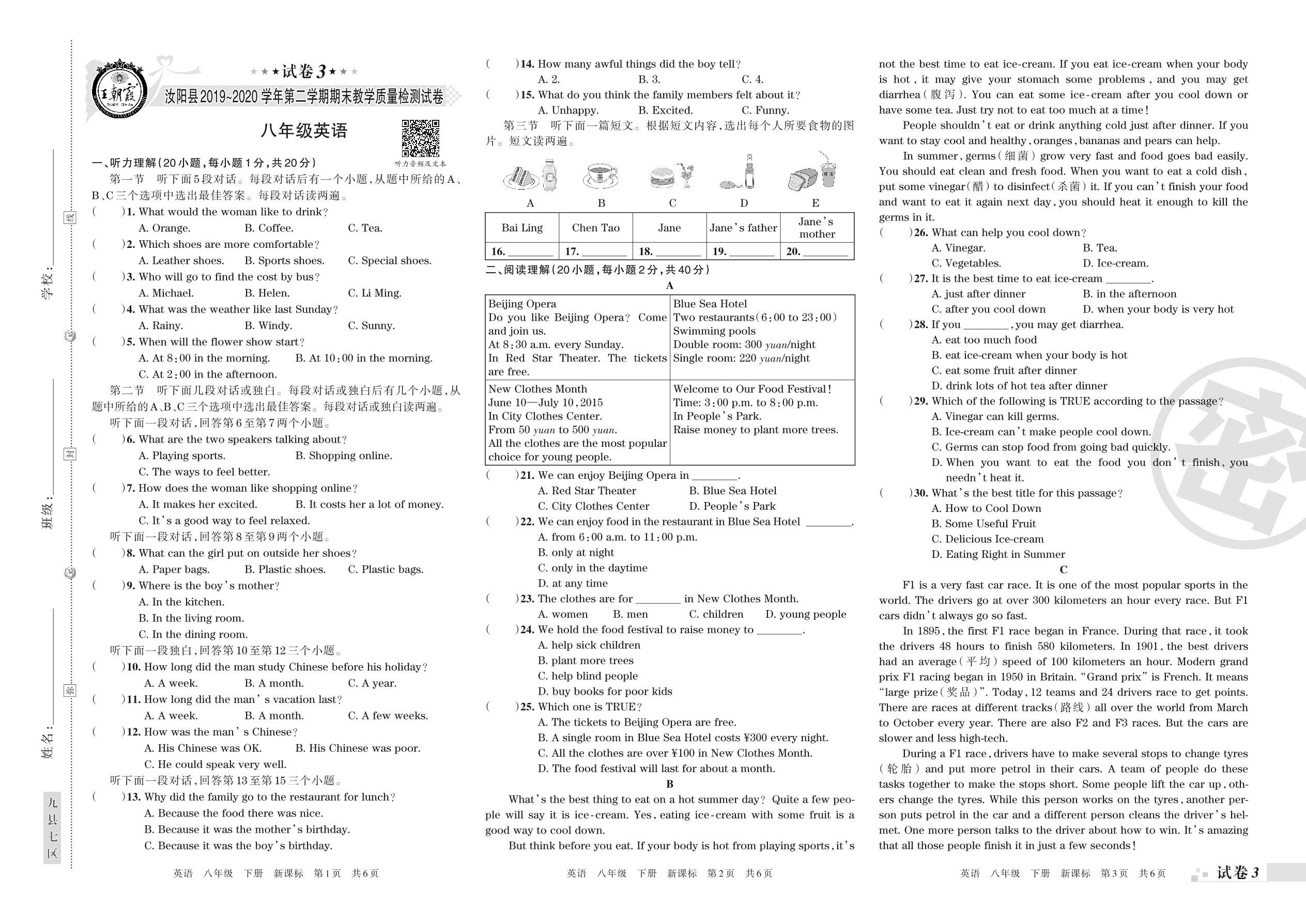 2019-2020学年第二学期洛阳市汝阳县八年级英语试卷(新课版)【3】