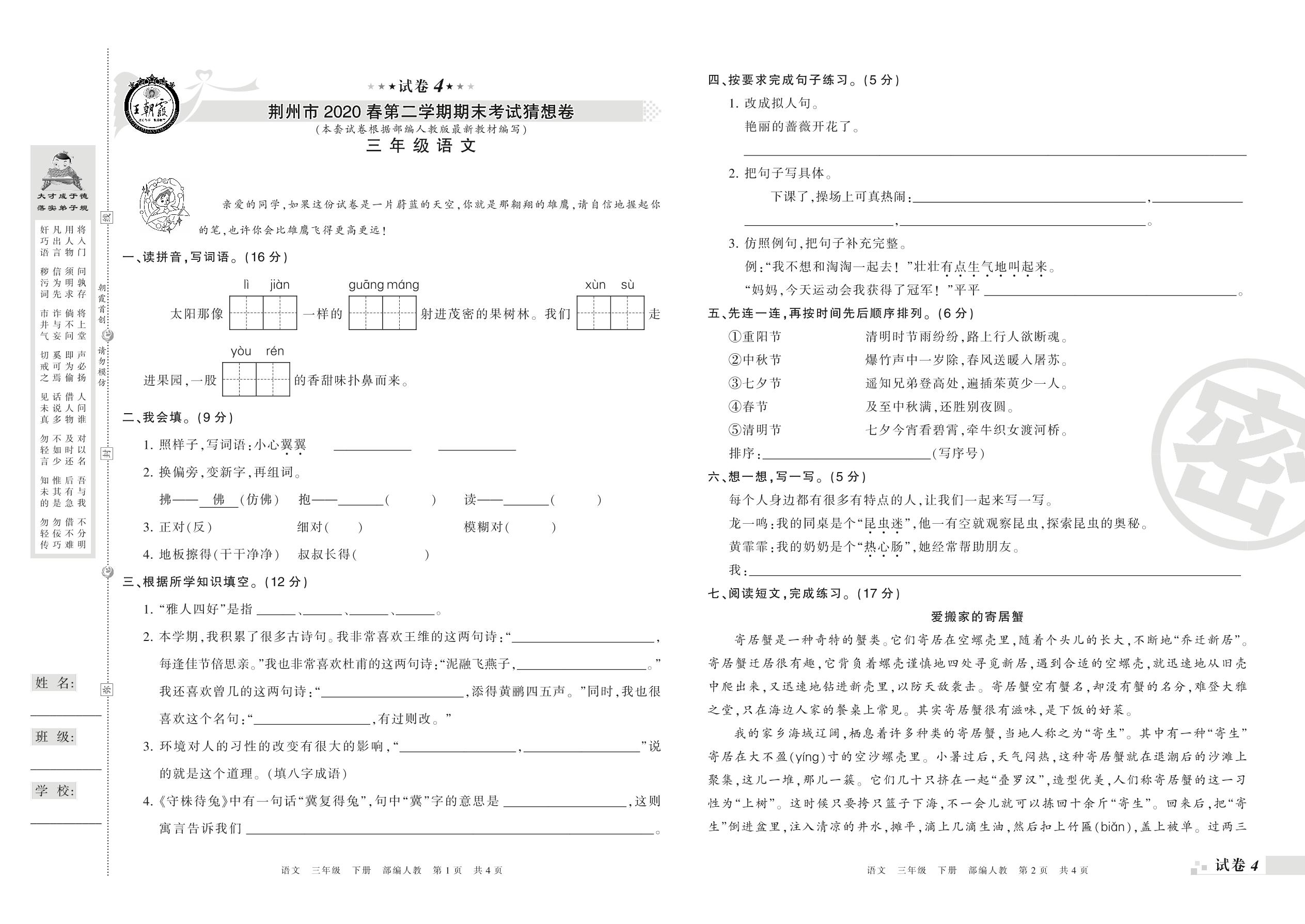 2018-2019学年第二学期荆州市猜想卷三年级语文试卷(人教版)【4】