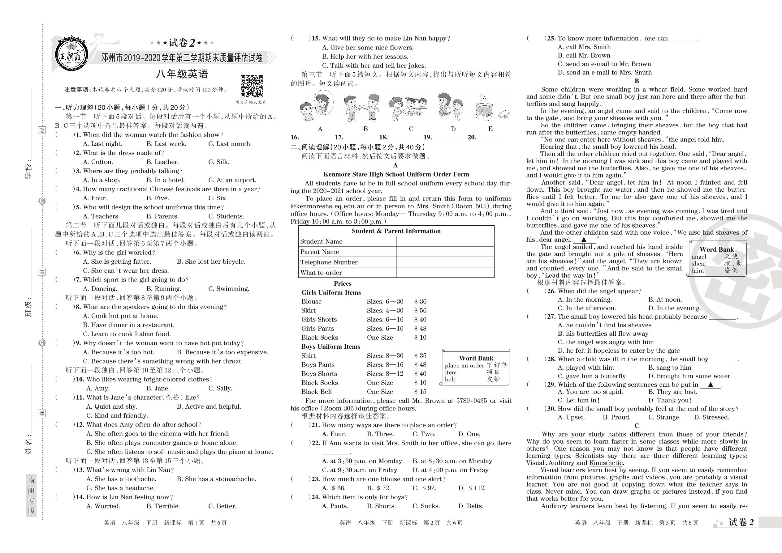 2019-2020学年第二学期邓州市八年级英语试卷(新课版)【2】