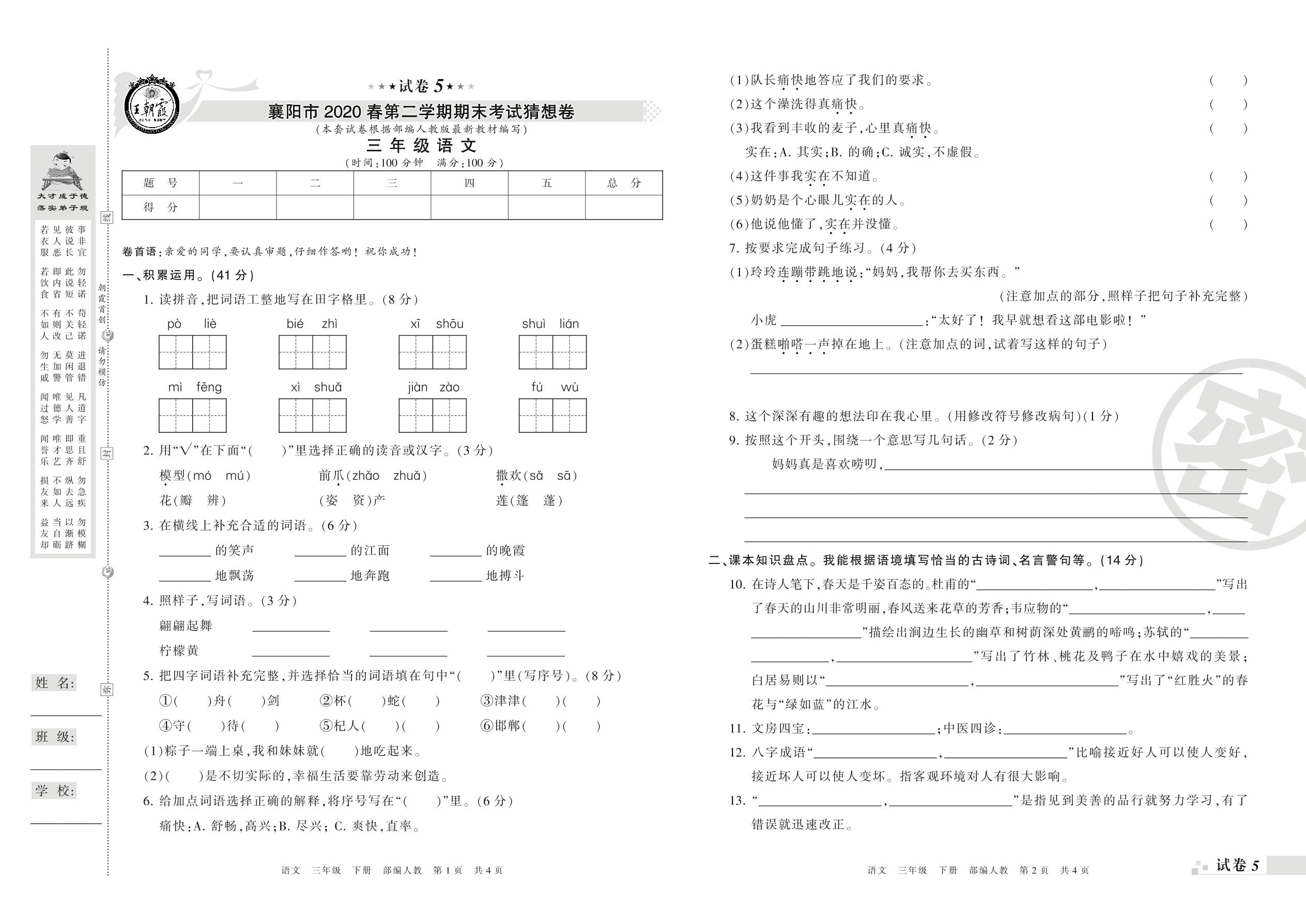 2018-2019学年第二学期襄阳市猜想卷三年级语文试卷(人教版)【5】
