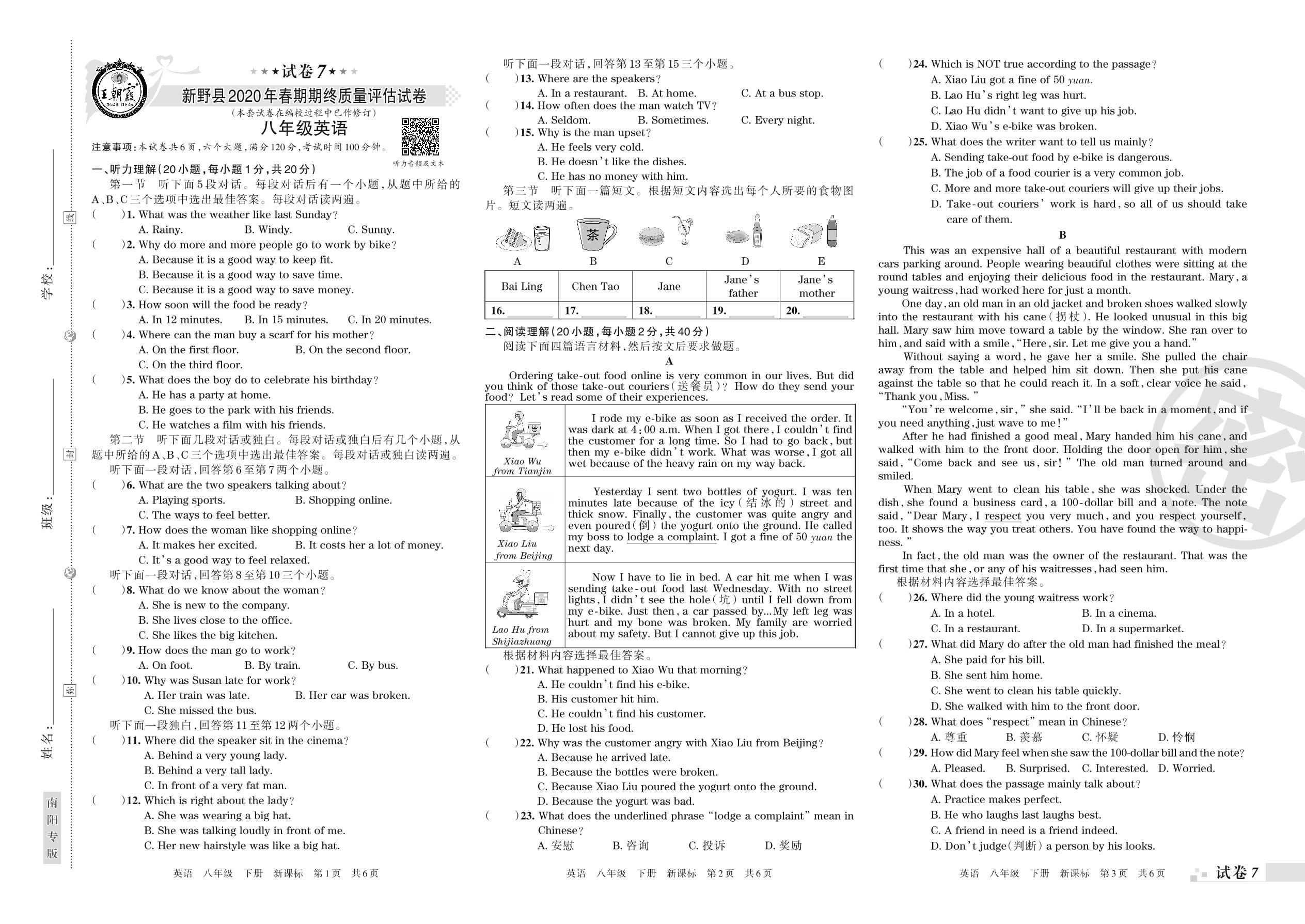 2019-2020学年第二学期南阳市新野县八年级英语试卷(新课版)【7】