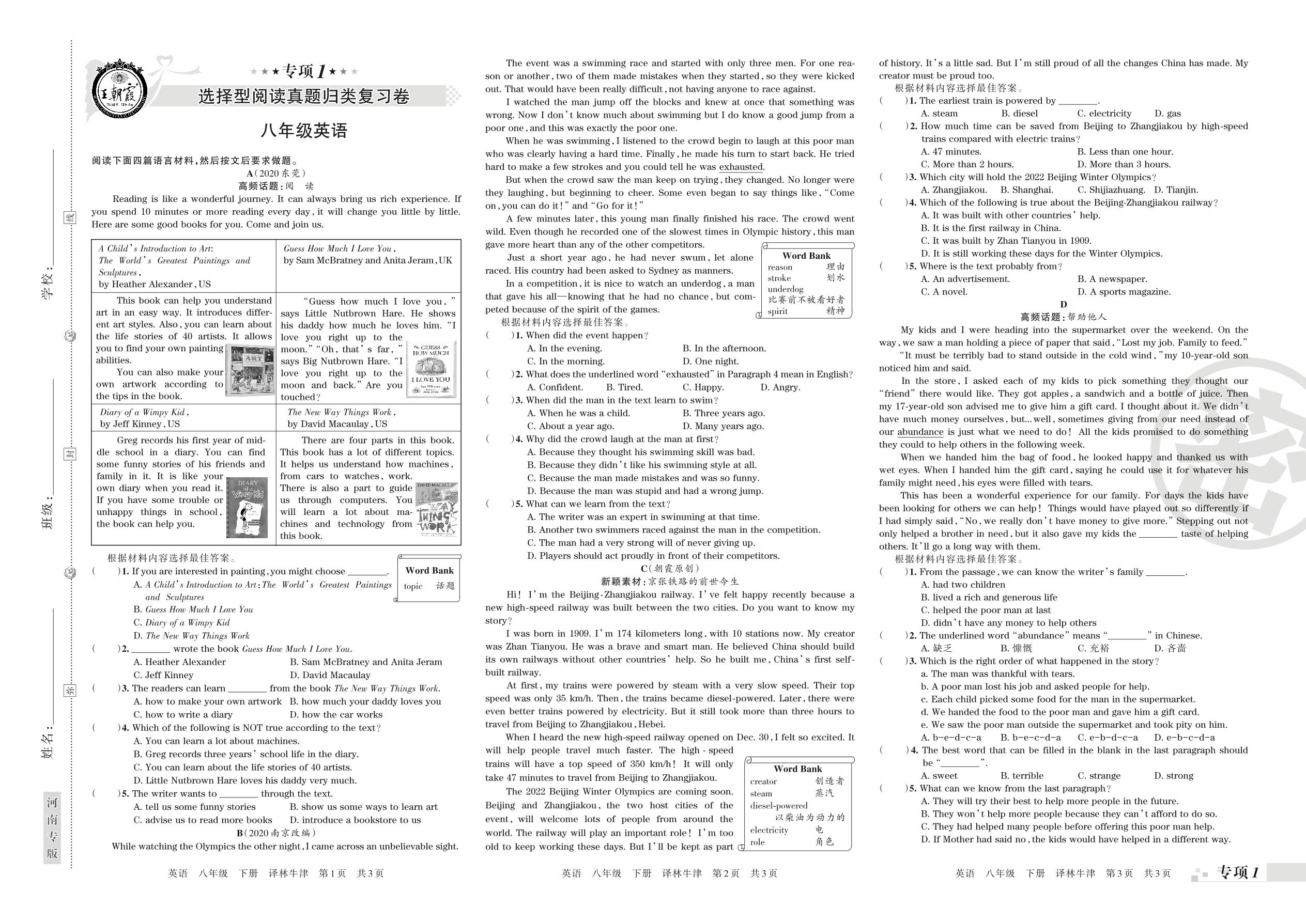 王朝霞期末专项卷——选择型阅读、任务型阅读真题归类复习八年级下册英语(译林版)【0】