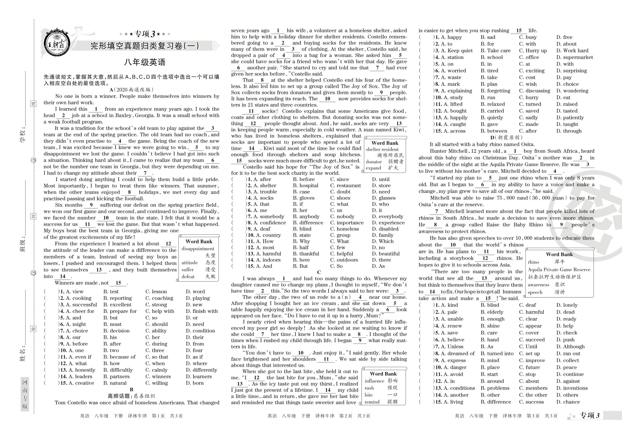 王朝霞期末专项卷——完形填空(一)、(二)真题归类复习八年级下册英语(译林版)【0】
