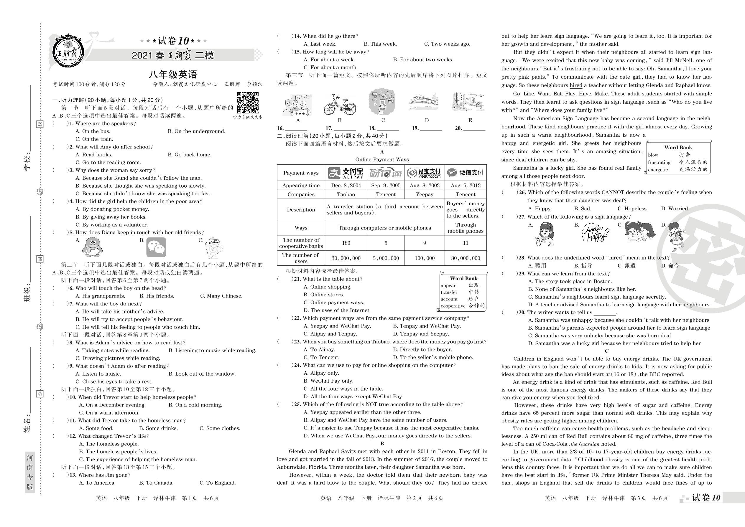 王朝霞期末模拟卷八年级下册英语(译林版)【10】