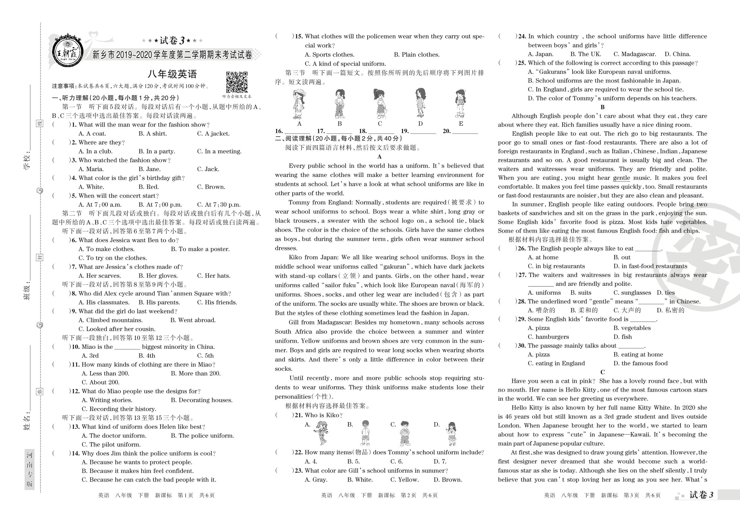 2019-2020学年第二学期新乡市八年级英语试卷(新课版)【3】