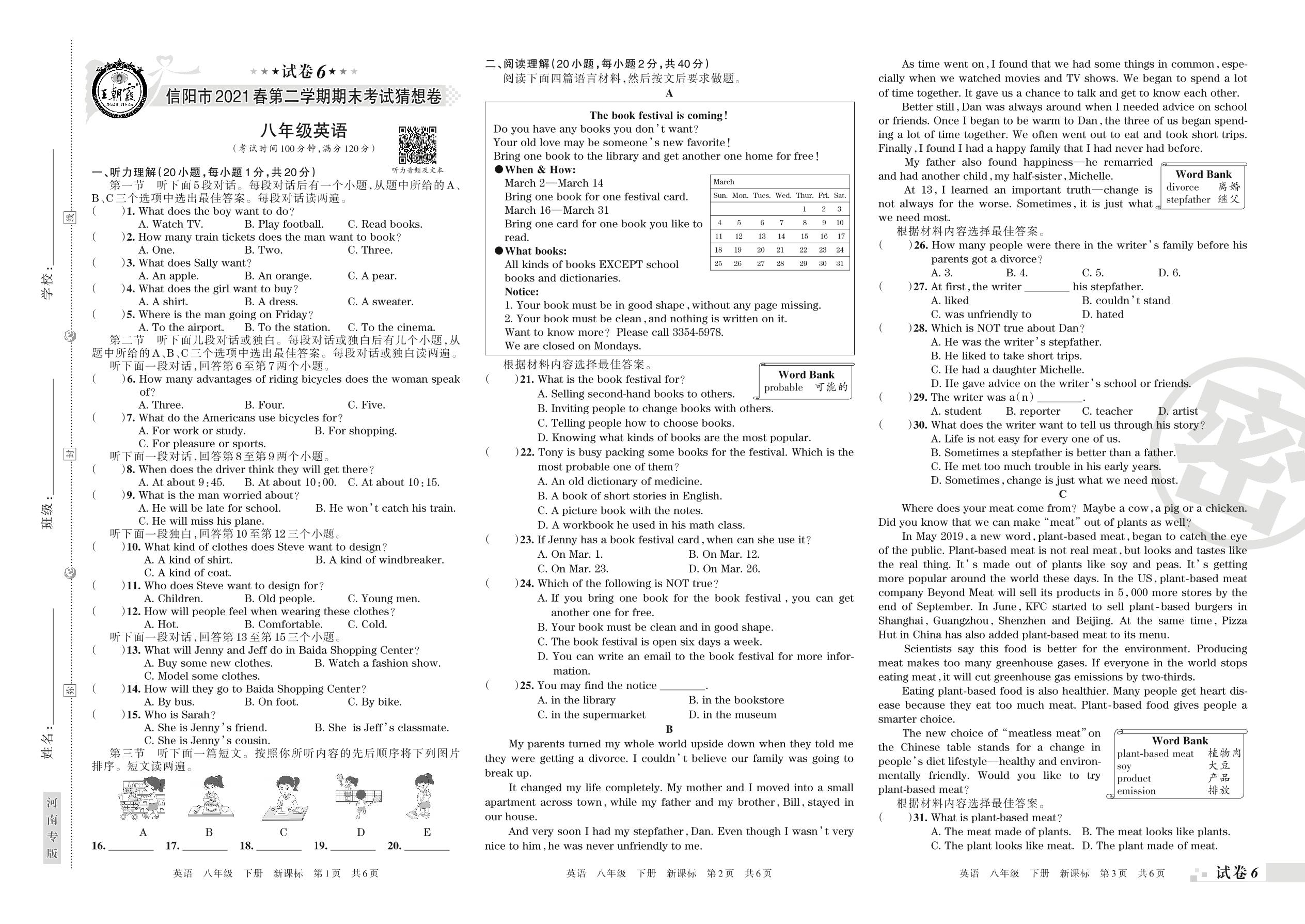 2020-2021学年第二学期信阳市八年级英语试卷(新课版)【6】