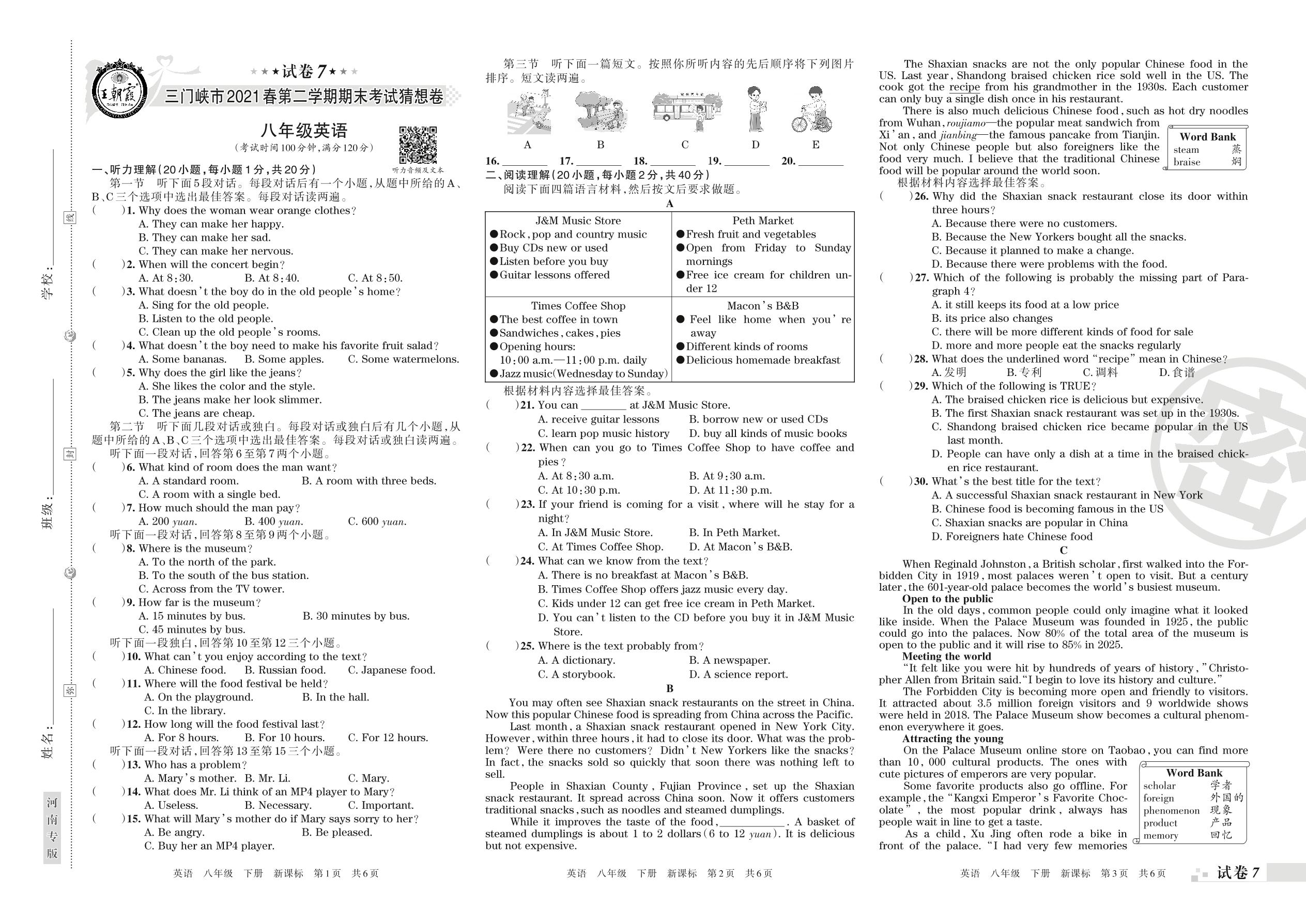 2020-2021学年第二学期三门峡市八年级英语试卷(新课版)【7】