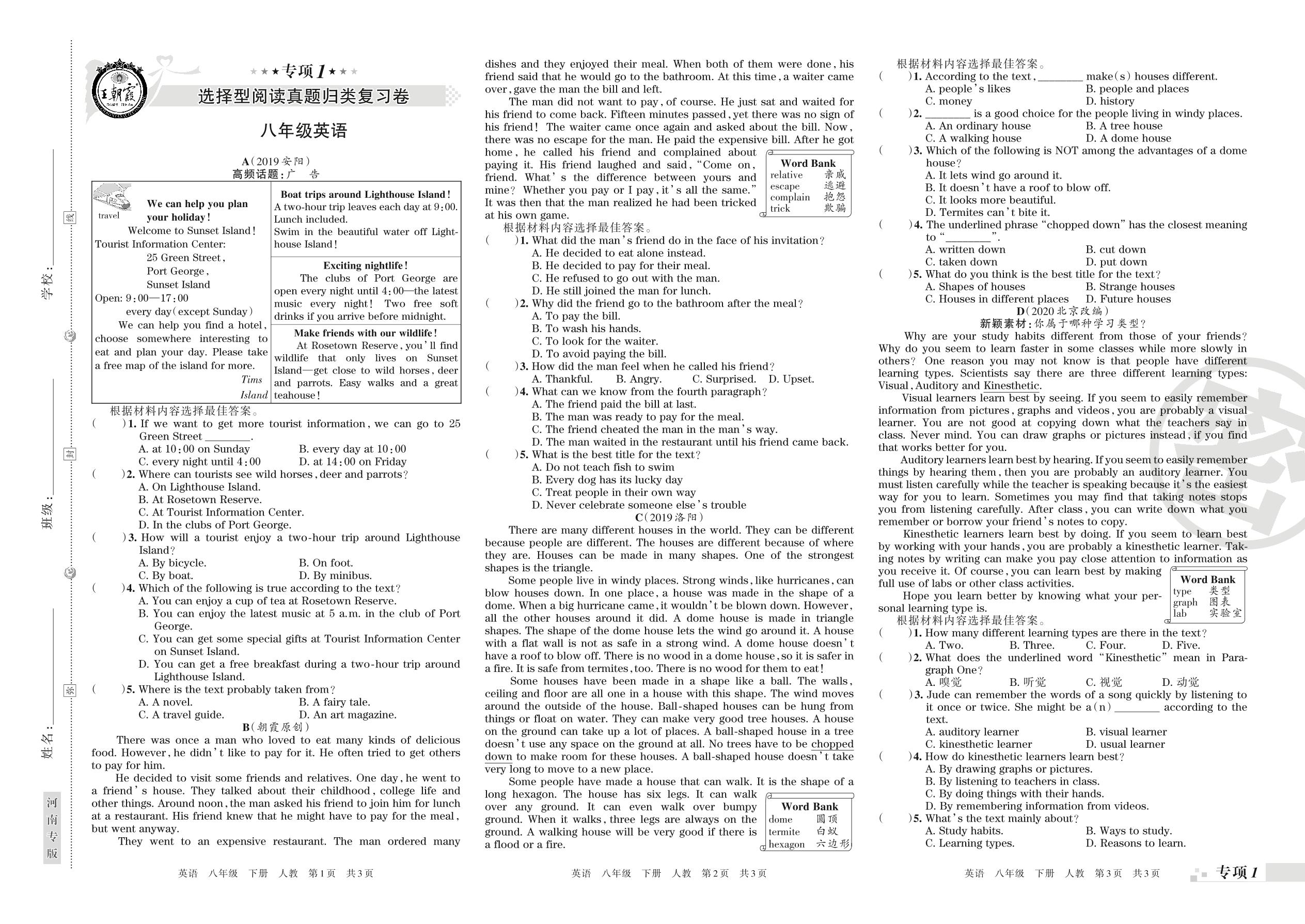 王朝霞期末专项卷——选择型阅读、任务型阅读真题归类复习八年级下册英语(人教版)【0】