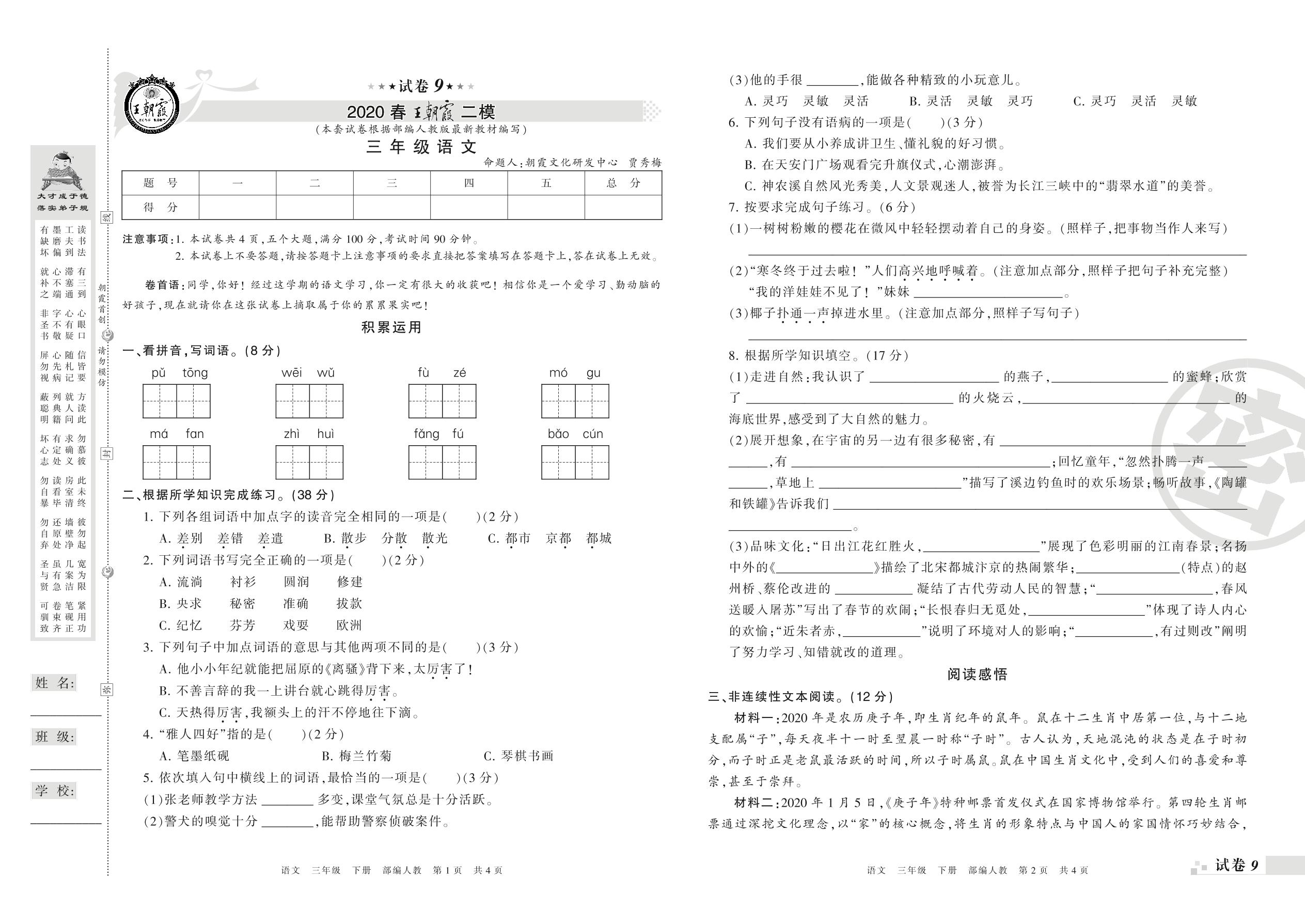 王朝霞期末模拟卷三年级下册语文(人教版)_R21080190823【9】