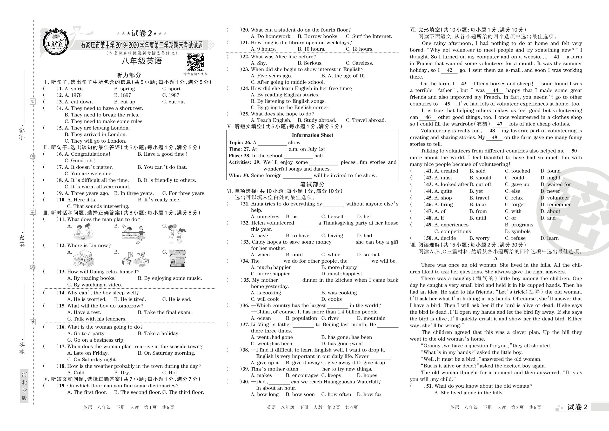 2019-2020学年第二学期石家庄市八年级英语试卷(人教版)【2】