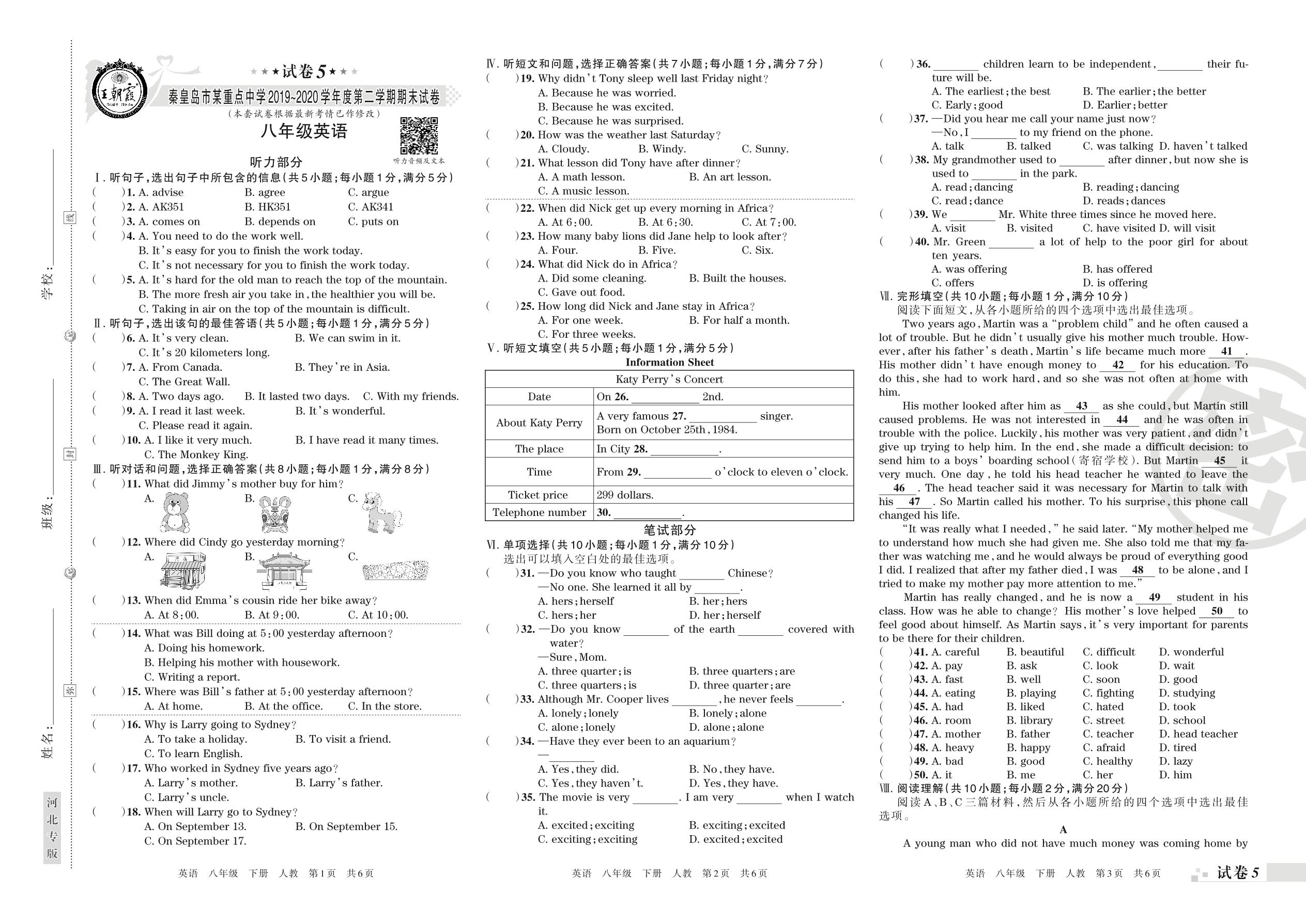 2019-2020学年第二学期秦皇岛市八年级英语试卷(人教版)【5】