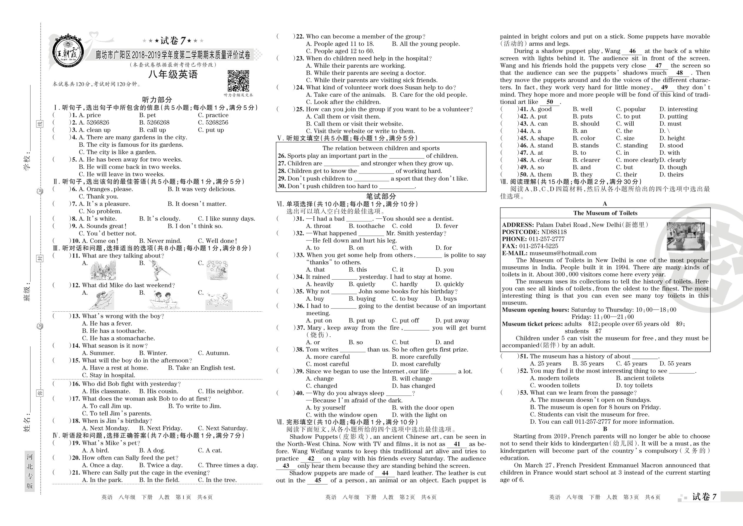 2018-2019学年第二学期廊坊市广阳区八年级英语试卷(人教版)【7】