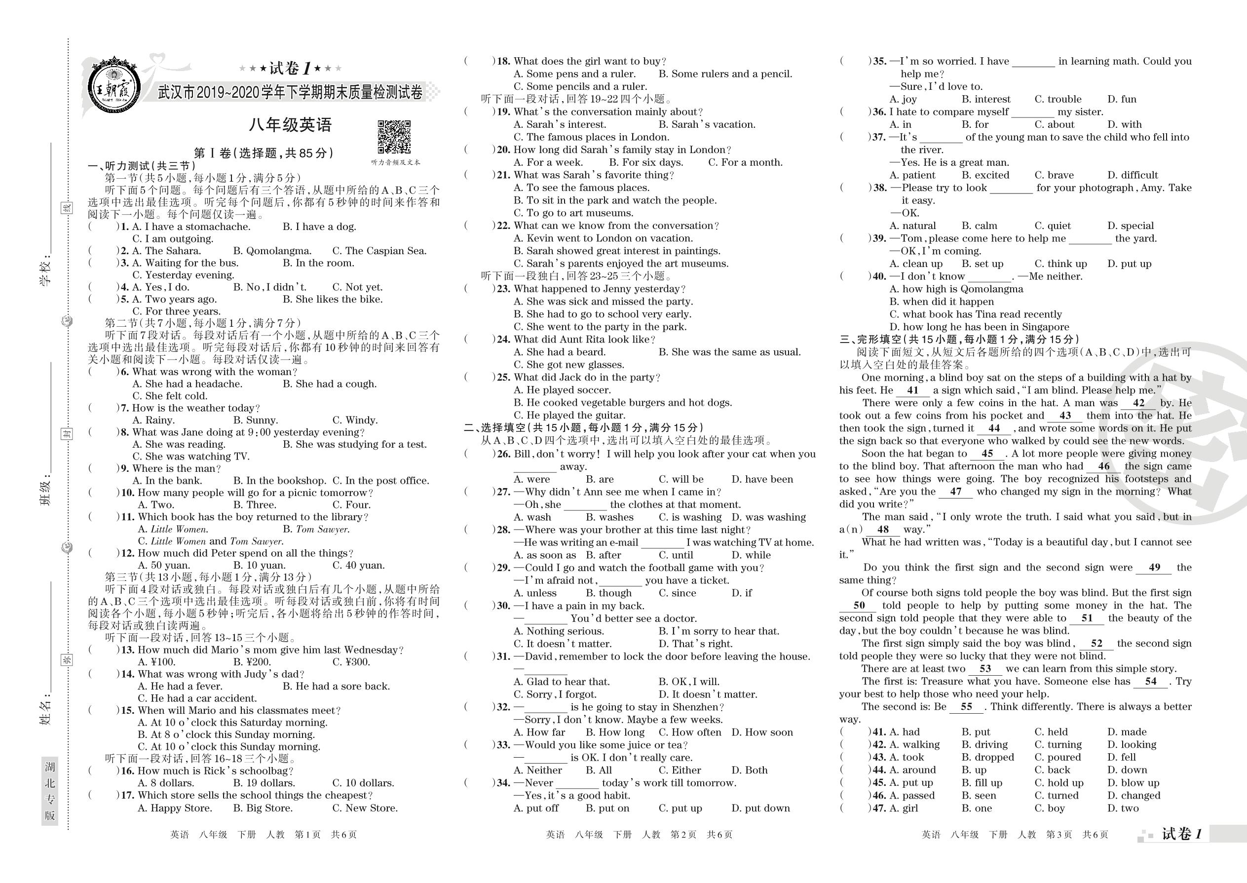 2019-2020学年第二学期武汉市八年级英语试卷(人教版)【1】