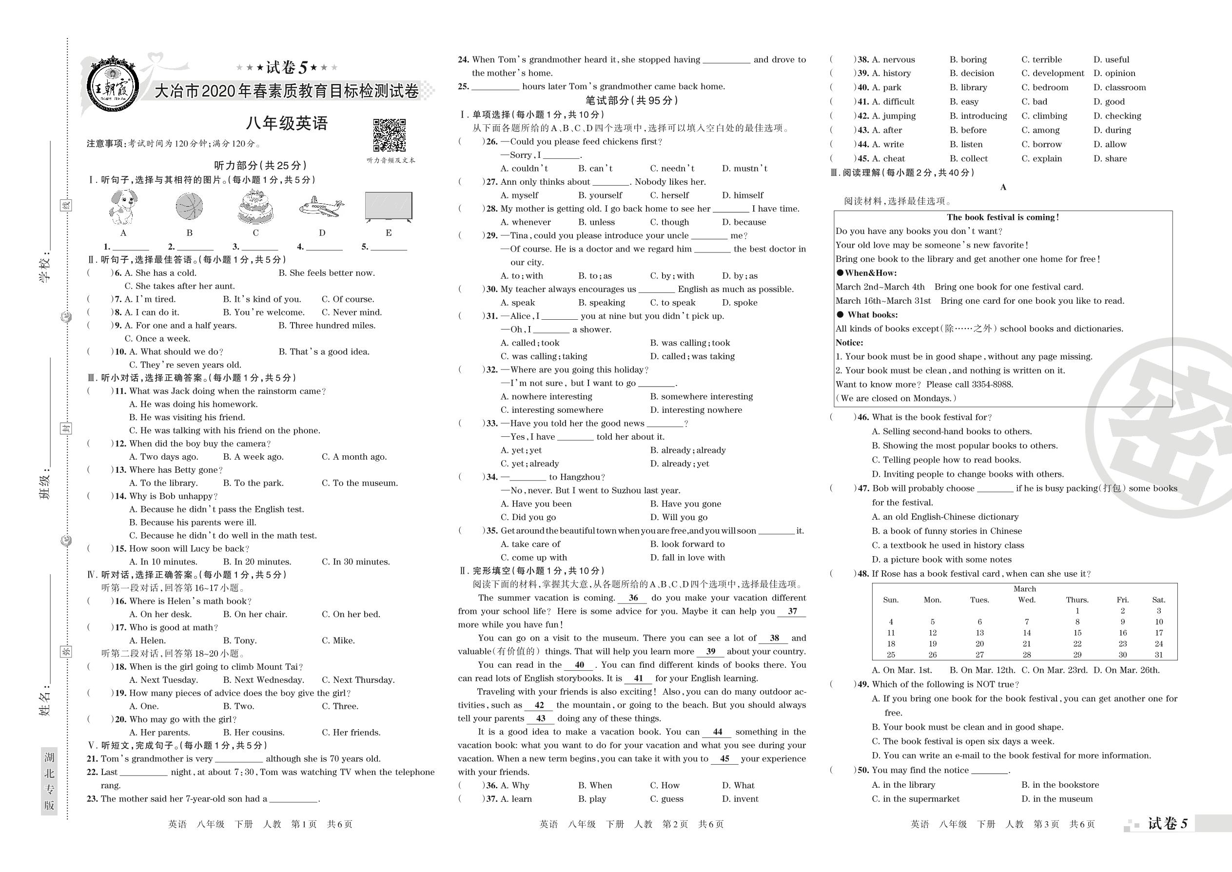 2019-2020学年第二学期大冶市八年级英语试卷(人教版)【5】