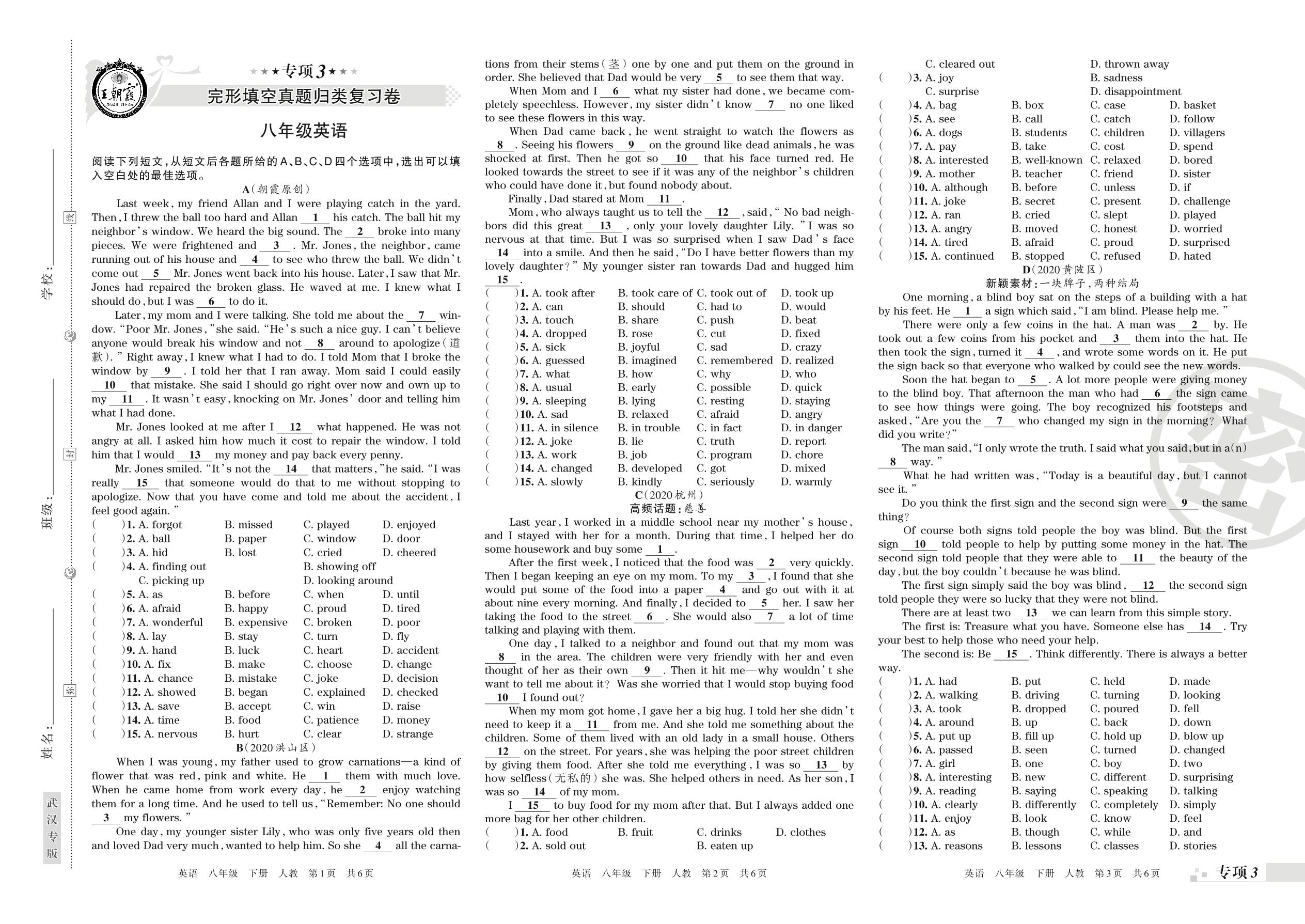 王朝霞期末专项卷——完形填空真题归类复习八年级下册英语(人教版)【0】
