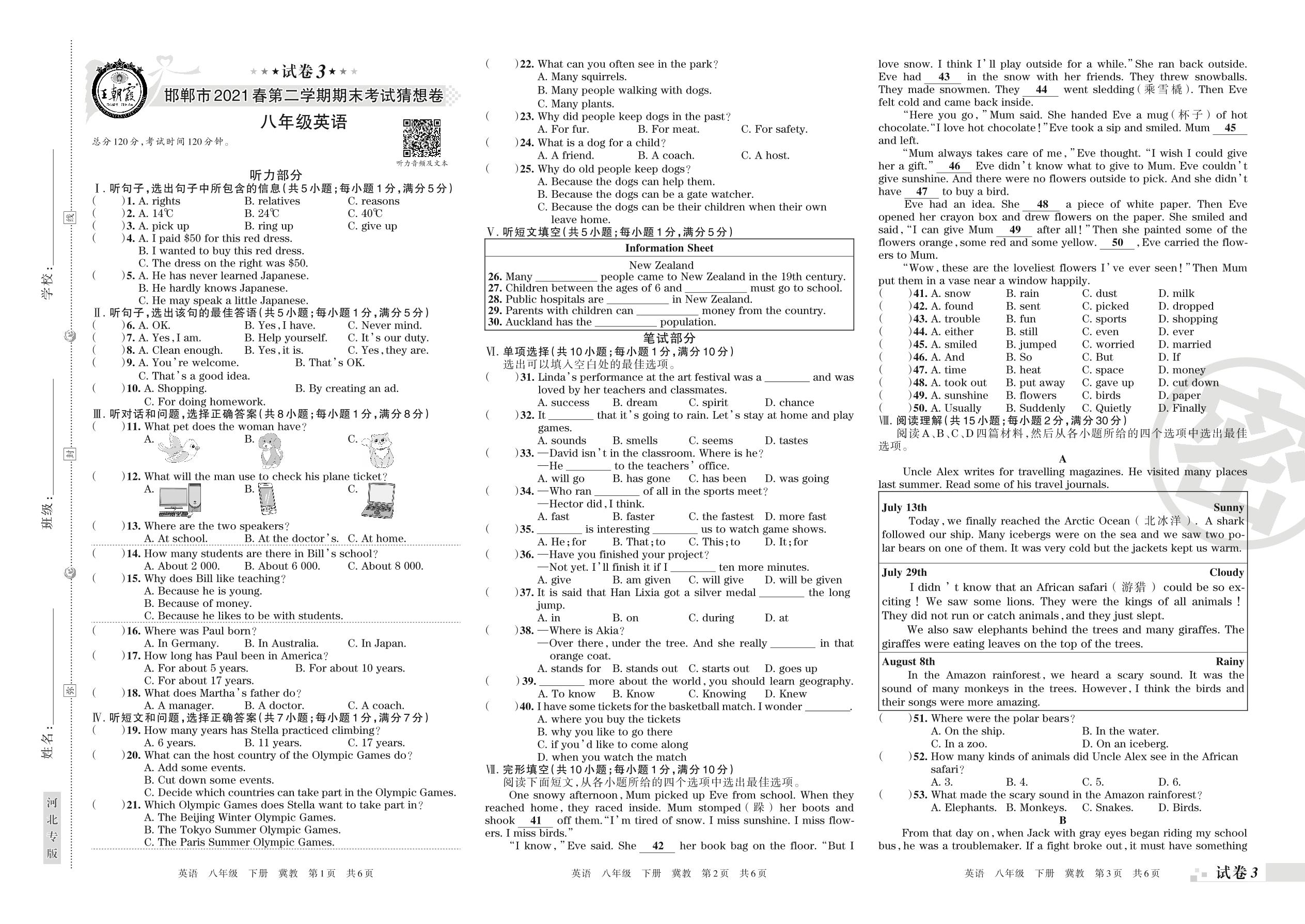 2020-2021学年第二学期邯郸市八年级英语试卷(冀教版)【3】