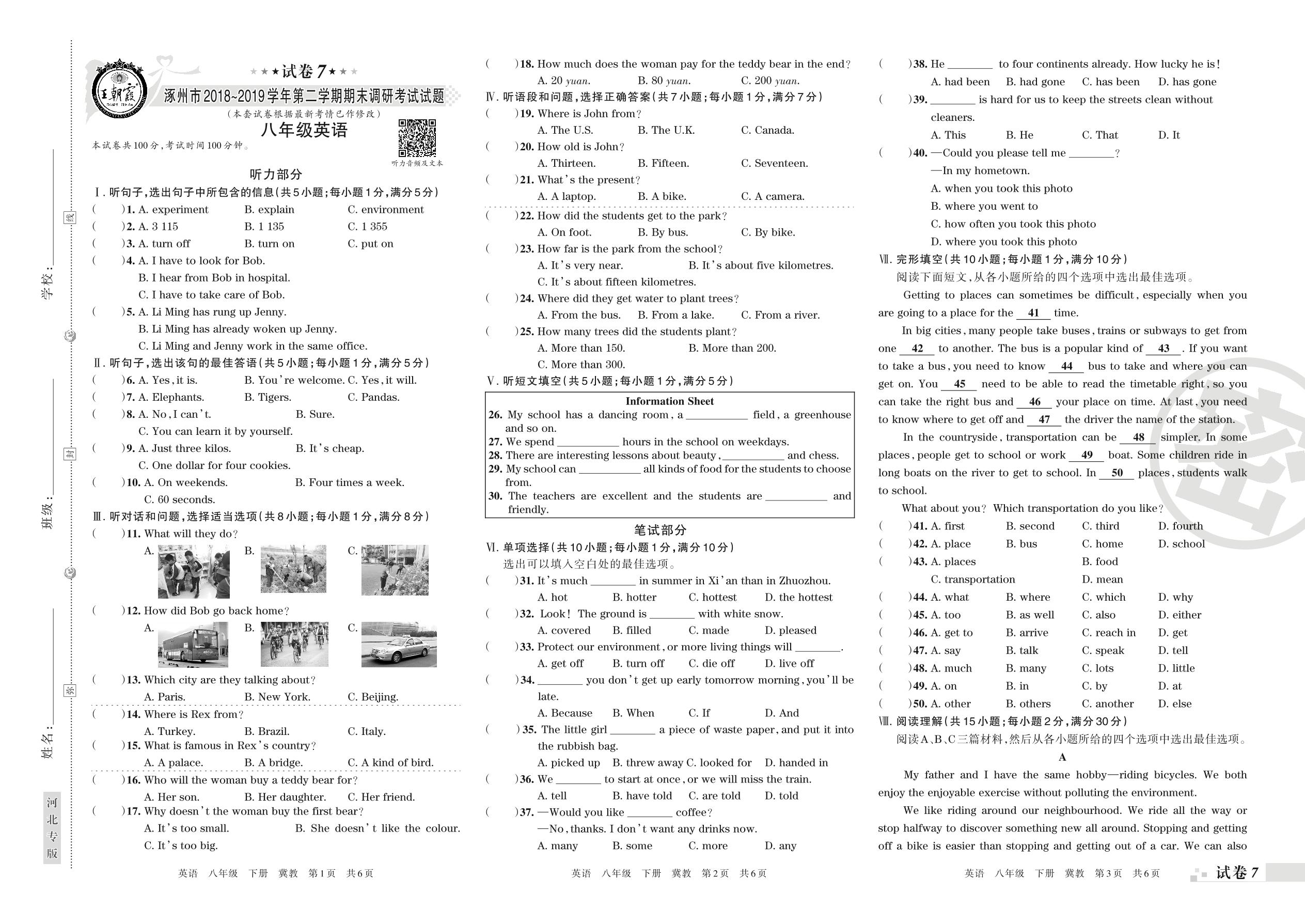 2018-2019学年第二学期涿州市八年级英语试卷(冀教版)【7】