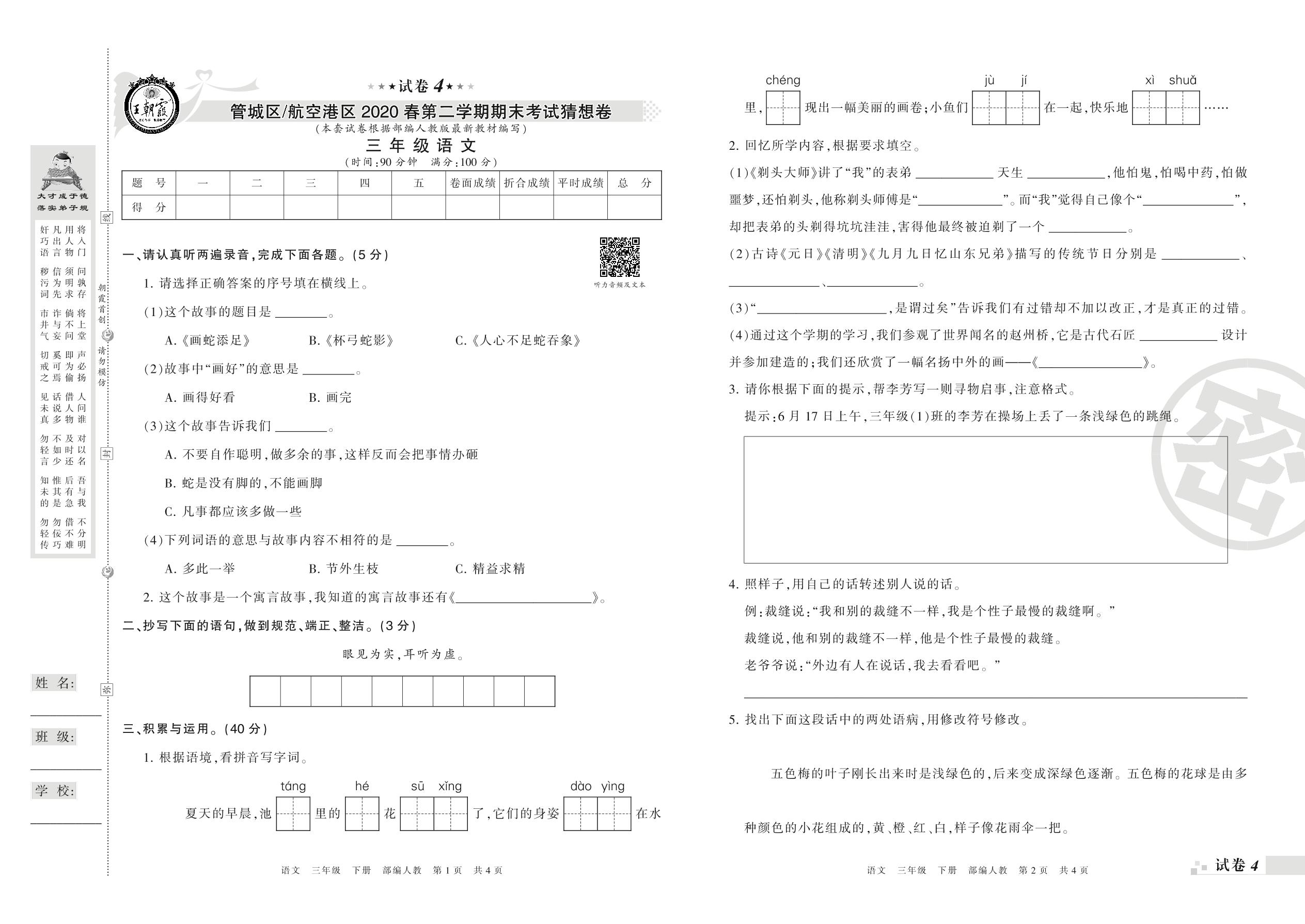 2018-2019学年第二学期郑州市管城区、航空港区猜想卷三年级语文试卷(人教版)【4】