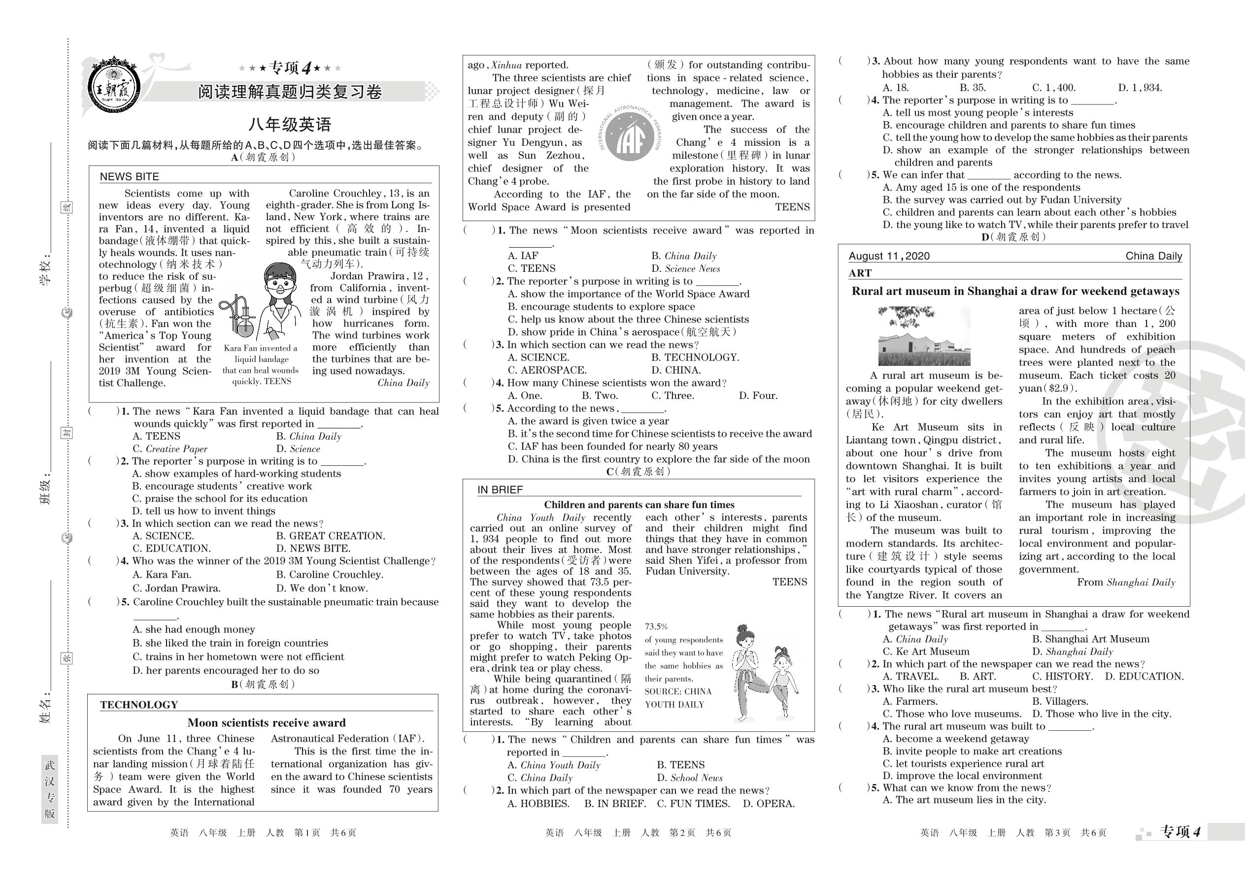 王朝霞期末专项卷——阅读理解真题归类复习八年级上册英语(人教版)【0】