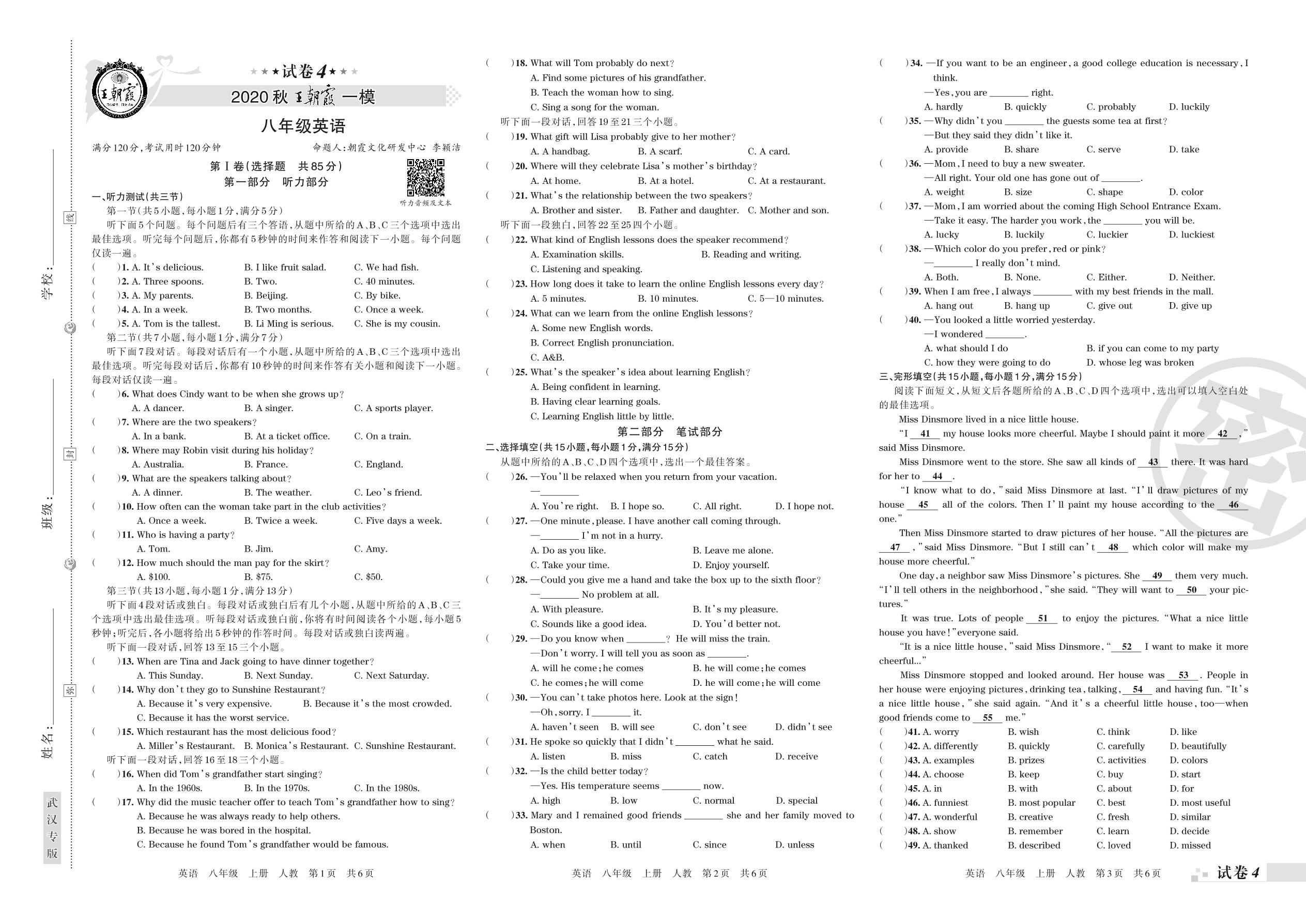 王朝霞期末模拟卷八年级上册英语(人教版)【4】
