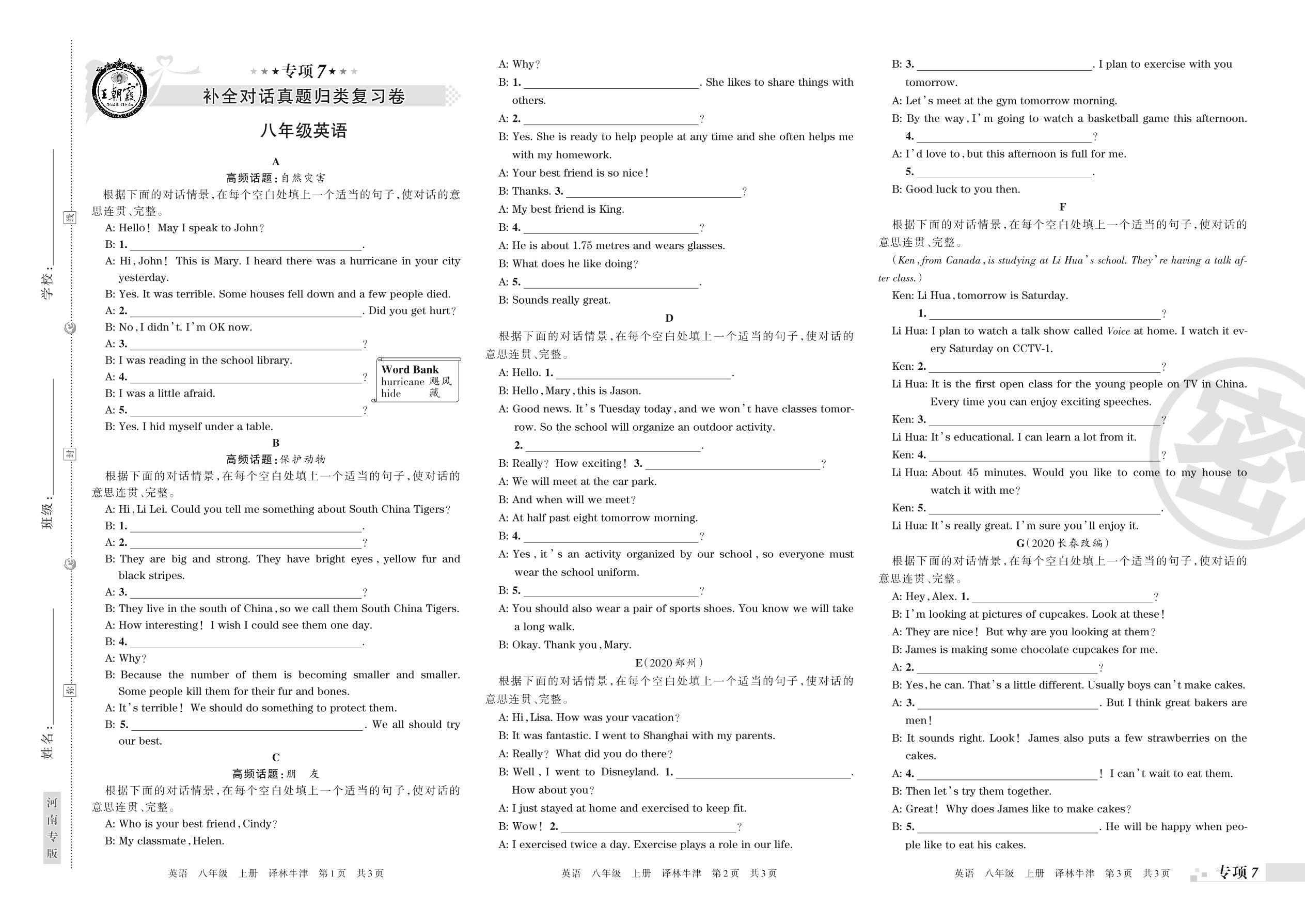 王朝霞期末专项卷——补全对话、书面表达真题归类复习八年级上册英语(译林版)【0】